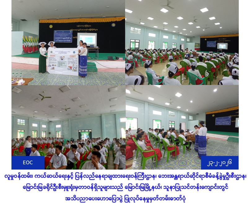 လူမှုဝန်ထမ်း၊ ကယ်ဆယ်ရေးနှင့် ပြန်လည်နေရာချထားရေးဝန်ကြီးဌာန၊ ဘေးအန္တရာယ်ဆိုင်ရာစီမံခန့်ခွဲမှု ဦးစီးဌာန၊ မြောင်းမြခရိုင်ဦးစီးမှူးရုံးမှ (၂၃-၂-၂၀၂၆) ရက်နေ့၊ နံနက်(၀၉:၃၀)နာရီမှ (၁၂:၀၀)နာရီအထိ မြောင်းမြမြို့နယ်၊ သူနာပြုသင်တန်းကျောင်းတွင် ကျောင်းအုပ်ဆရာမကြီးနှင့်တကွ ဆရာ/ဆရာမများ၊ ကျောင်းသား/ ကျောင်းသူ (၁၅၈) ဦးတို့အား ဦးစီးဌာနလုပ်ငန်းဆောင်ရွက်နေမှုများ၊ ထောက်ပံ့ပေးမှုများ၊ မီးခိုးညစ်ညမ်းမှုအကြောင်း၊ တောမီးအန္တရာယ်အကြောင်းနှင့် ပလတ်စတစ်ညစ်ညမ်းမှု၊ မီးဘေး၊ ငလျင်ဘေး အပါအဝင် သဘာဝဘေးအန္တရာယ်များနှင့် ပတ်သက်သည့် ဆောင်ရန်၊ ရှောင်ရန်အချက်များအား ဆွေးနွေးဟောပြောခဲ့ပြီး လက်ကမ်းစာစောင်နှင့်ဗီနိုင်းပိုစတာများ ဖြန့်ဝေပေးခဲ့ကြောင်း သတင်းရရှိပါသည်။ #ar #ayy_feb_2026 Source: မြောင်းမြခရိုင်ဦးစီးမှူးရုံး