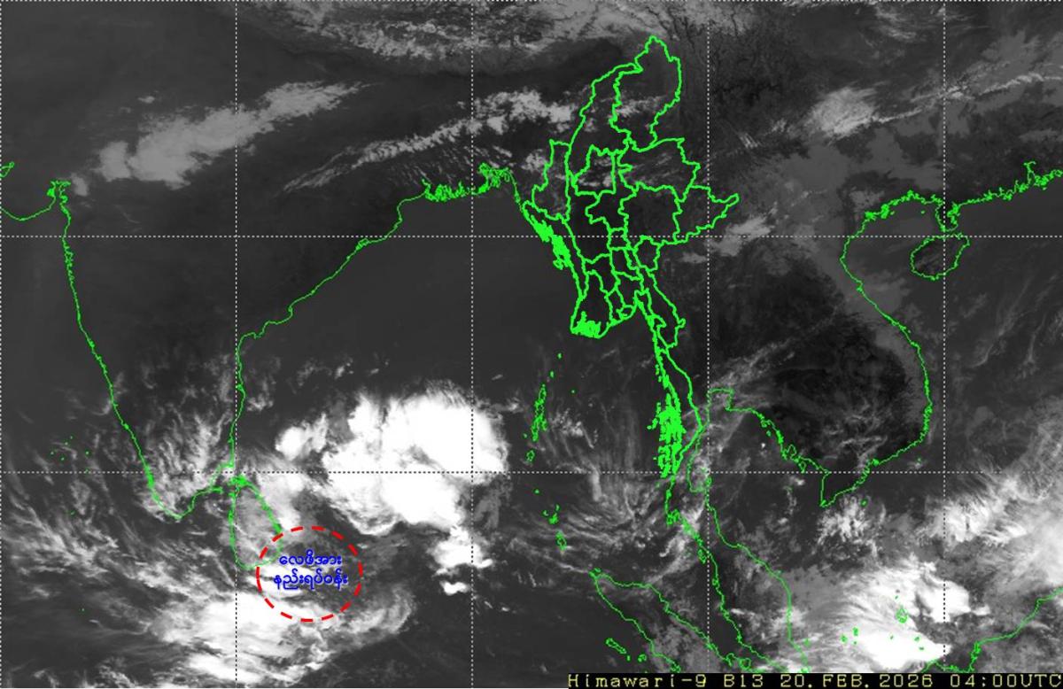 ၂၀၂၆ ခုနှစ်၊ ဖေဖော်ဝါရီလ ၂၀ ရက်နေ့ မြန်မာစံတော်ချိန် (၀၇:၀၀) နာရီအချိန်တွင် မိုးလေဝသနှင့် ဇလဗေဒညွှန်ကြားမှုဦးစီးဌာနမှ “လေဖိအားနည်းရပ်ဝန်းအခြေအနေ” ကို အောက်ပါအတိုင်း ထုတ်ပြန် ထားပါသည်- ယနေ့မြန်မာစံတော်ချိန် ၀၅:၃၀ နာရီအချိန် တိုင်းထွာချက်များအရ အီကွေတာအနီးအိန္ဒိယ သမုဒ္ဒရာနှင့် ယင်းနှင့်ဆက်စပ်လျက်ရှိသော ဘင်္ဂလားပင်လယ်အော်အနောက်တောင်ပိုင်းတို့တွင် ဖြစ်ပေါ်နေသော လေဖိအားနည်းရပ်ဝန်း (Low Pressure Area) သည် ဆက်လက်တည်ရှိနေပါသည်။ အဆိုပါ လေဖိအားနည်းရပ်ဝန်းသည် အနောက်-အနောက်မြောက်ဘက်သို့ ရွေ့လျားနိုင်ပြီး နောက် ၂၄ နာရီအတွင်း သီရိလင်္ကာနိုင်ငံသို့ ဦးတည်ရွေ့လျားနိုင်မည်ဟု ခန့်မှန်းရပါသည်။