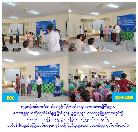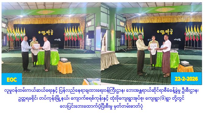ဥတ္တရခရိုင်၊ တပ်ကုန်းမြို့နယ်၊ ကျောက်စရစ်ကုန်းနှင့် ထုံးဖိုကျေးရွာအုပ်စု၊ ကျေးရွာ(၆)ရွာ တို့တွင် လေပြင်းဘေးထောက်ပံ့ပြီးစီးမှု သတင်း လူမှုဝန်ထမ်းကယ်ဆယ်ရေးနှင့်ပြန်လည်နေရာချထားရေးဝန်ကြီးဌာန၊ဘေးအန္တရာယ်ဆိုင်ရာစီမံခန့်ခွဲမှုဦးစီးဌာန၊ဥတ္တရခရိုင်ဦးစီးမှူးရုံးမှ တာဝန်ရှိသူများသည် (၂၁.၂.၂၀၂၆)ရက်နေ့တွင်တပ်ကုန်းမြို့နယ်၊ ကျောက်စရစ်ကုန်းနှင့် ထုံးဖိုကျေးရွာအုပ်စု၊ ကျေးရွာ(၆)ရွာတို့တွင်ဖြစ်ပွားခဲ့သော လေပြင်းဘေး ကြောင့်၊ တစ်စိတ်တစ်ပိုင်းပျက်စီးခဲ့သည့်နေအိမ်(၅၀)လုံးတို့အတွက် အိမ်ဆောက်ပစ္စည်းဖိုးထောက်ပံ့ငွေ (၂၅၀၀၀၀၀ိ/-)အား (၂၂.၂.၂၀၂၆)ရက်နေ့၊(၀၉း၃၀)အချိန်တွင် တပ်ကုန်းမြို့နယ်၊ အထွေထွေအုပ်ချုပ်ရေး ဦးစီးဌာနခန်းမ၌တပ်ကုန်းမြို့နယ်အထွေထွေအုပ်ချုပ်ရေးဦးစီးဌာနမှတာဝန်ရှိသူများ၊နေပြည်တော်တိုင်းဦးစီးမှူးရုံး မှတာဝန်ရှိသူများနှင့်အတူဘေးသင့်ပြည်သူများလက်ဝယ်သို့ သွားရောက်ထောက်ပံ့ပေးအပ်ခဲ့ပါကြောင်း သတင်းရရှိပါသည်။ #ha_sgw #npw_feb_2026 #Source: ဥတ္တရခရိုင်ဦးစီးမှူးရုံး(ဘစမ)