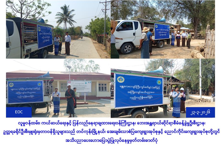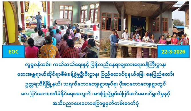 လူမှုဝန်ထမ်း၊ ကယ်ဆယ်ရေးနှင့်ပြန်လည်နေရာချထားရေးဝန်ကြီးဌာန၊ ဘေးအန္တရာယ်ဆိုင်ရာ စီမံခန့်ခွဲမှုဦးစီးဌာန၊ ပြည်ထောင်စုနယ်မြေ၊ နေပြည်တော်၊ဥတ္တရခရိုင်ဦးစီးမှူးရုံးမှ တာ၀န်ရှိသူ များသည် မန္တလေးငလျင်ကြီးလှုပ်ခတ်မှု (၁)နှစ်ပြည့်အကြိုအသိပညာပေးလှုပ်ရှားမှုအဖြစ် (၂၂.၃.၂၀၂၆)ရက်နေ့၌ နေ့လည်ပိုင်းအချိန်တွင် တပ်ကုန်းမြို့နယ်အတွင်းရှိ ရှောက်ကုန်း ကျေးရွာအုပ်စု(ရှောက်ကုန်း၊ပုဏ္ဏမာ၊ ရွာတော်ကုန်း၊ နောင်ခမ်း၊ သာယာအေး) ကျေးရွာတို့ တွင် ငလျင်အသိပညာပေးလှည့်လည်နှိုးဆော်ခြင်းများ ဆောင်ရွက်ခဲ့ပြီး ဥတ္တရခရိုင်၊ တပ်ကုန်း မြို့နယ်၊ လွှပုံကျေးရွာအုပ်စု၊ လွှပုံကျေးရွာ၌ (၂၀.၃.၂၀၂၆)ရက်နေ့ (၁၈း၀၀) အချိန်ခန့်တွင် ဖြစ်ပွားခဲ့သော လေဘေးကြောင့် တစ်စိတ်တစ်ပိုင်း ပျက်စီးခဲ့သော လူနေအိမ် (၄)လုံးအတွက် အိမ်ဆောက်ပစ္စည်းဖိုးထောက်ပံ့ငွေ (၂၀၀,၀၀၀ိ/-)၊ဘေးသင့်လူဦးရေ(၁၈)ဦးအတွက် ဆန်ရိက္ခာ … Read more