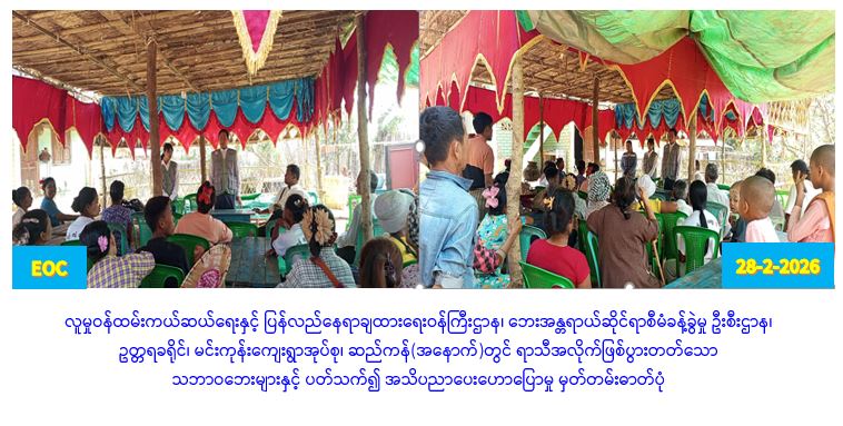 ဥတ္တရခရိုင်၊ မင်းကုန်းကျေးရွာအုပ်စု၊ ဆည်ကန်(အနောက်)တွင်ရာသီအလိုက်ဖြစ်ပွားတတ်သော သဘာဝဘေးများနှင့် ပတ်သက်၍ အသိပညာပေးဟောပြောမှုသတင်း လူမှုဝန်ထမ်း၊ကယ်ဆယ်ရေးနှင့်ပြန်လည်နေရာချထားရေးဝန်ကြီးဌာန၊ ဘေးအန္တရာယ်ဆိုင်ရာစီမံခန့်ခွဲမှု ဦးစီးဌာန၊ ပြည်ထောင်စုနယ်မြေ၊ နေပြည်တော်၊ ဥတ္တရခရိုင်ဦးစီးမှူးရုံးမှ တာ၀န်ရှိသူများသည် (၂၈.၂. ၂၀၂၆)ရက်နေ့၊နံနက်(၁၁း၃၀)အချိန်မှ (၁၃း၃၀)အချိန်ထိ ဥတ္တရသီရိမြို့နယ်၊ မင်းကုန်းကျေးရွာအုပ်စု၊ ဆည်ကန်(အနောက်)တွင် ကျေးရွာသူ/ ကျေးရွာသား (၆၀)ဦးတို့အား ရာသီအလိုက်ဖြစ်ပွားတတ်သော သဘာဝဘေးအန္တရာယ်များနှင့်ပတ်သက်၍ (ဆောင်ရန်/ ရှောင်ရန်) များအားအသိပညာပေးဟောပြောပွဲ ဆောင်ရွက်ခဲ့ကြောင်း သတင်းရရှိပါသည်။ #ar #npw_feb_2026 #Source: ဥတ္တရခရိုင်ဦးစီးမှူးရုံး(ဘစမ)