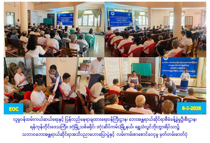 ရန်ကုန်တိုင်းဒေသကြီး၊ ဒဂုံမြို့သစ်ခရိုင်၊ ဒဂုံ(ဆိပ်ကမ်း)မြို့နယ်၊ ရွှေသံလွင်ဘိုးဘွားရိပ်သာ၌ သဘာဝဘေးအန္တရာယ်ဆိုင်ရာအသိပညာဟောပြောပွဲနှင့် လမ်းကမ်းစာစောင်ဝေငှမှုသတင်း