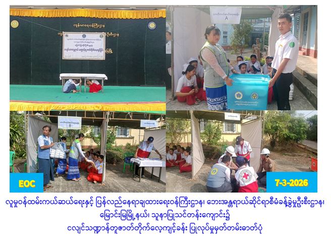 လူမှုဝန်ထမ်း၊ကယ်ဆယ်ရေးနှင့်ပြန်လည်နေရာချထားရေးဝန်ကြီးဌာန၊ ဘေးအန္တရာယ်ဆိုင်ရာစီမံခန့်ခွဲမှု ဦးစီးဌာန၊ ရန်ကုန်တိုင်းဒေသကြီးဦးစီးမှူးရုံးမှ တာဝန်ရှိသူများသည် ကမာရွတ်ခရိုင်၊ ဗဟန်းမြို့နယ်ရှိ နှင်းဆီကုန်းဘိုးဘွားရိပ်သာ၌ (၃-၃-၂၀၂၆)ရက်နေ့တွင် နံနက် (၉၀:၃၀)နာရီမှ (၁၁:၀၀)နာရီအထိ သဘာဝဘေးအန္တရာယ်များနှင့်စပ်လျဉ်း၍ဆွေးနွေးခြင်း၊ သဘာဝဘေးအသိပညာပေးဟောပြောပွဲပြု လုပ်ခြင်း၊ ငလျင်သဏ္ဍာန်တူဇာတ်တိုက်လေ့ကျင့်ခန်းပြုလုပ်ရန်အတွက် အကြိုညှိနှိုင်းဆွေးနွေးခြင်း များပြုလုပ်ခဲ့ပြီး (၄-၃-၂၀၂၆)ရက်နေ့တွင် နံနက် (၀၉:၃၀)နာရီမှ (၁၂:၀၀)အထိ ငလျင်သဏ္ဍာန်တူ ဇာတ်တိုက်လေ့ကျင့်ခြင်းအား ဘေးအန္တရာယ်ဆိုင်ရာစီမံခန့်ခွဲမှုဦးစီးဌာနမှ အရာထမ်း၊ အမှုထမ်းများ၊ နှင်းဆီကုန်းဘိုးဘွားရိပ်သာရှိအုပ်ချုပ်သူများ၊ အမှုဆောင်များ၊ ဆရာ၊ ဆရာမများ၊ ဝန်ထမ်းများနှင့် ဝန်ထမ်းမိသားစုများ၊ အဘိုး၊ အဘွားများပူးပေါင်း၍ ငလျင်သဏ္ဍာန်တူဇာတ်တိုက်လေ့ကျင့်ခန်းအား ဆောင်ရွက်ခဲ့ကြောင်း သတင်း ရရှိပါသည်။ #eq … Read more