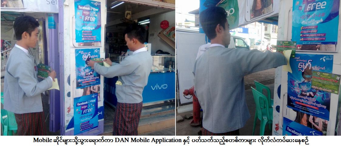 ပြည်ထောင်စုဝန်ကြီး လမ်းညွှန်ထားရှိချက်အား အကောင်အထည်ဖော်ဆောင်ရွက်ရန်အတွက် ကယ်ဆယ်ရေးဦးစီးဌာန (ရုံးချုပ်) မှ တာဝန်ရှိသူ များသည် (၅-၁-၂၀၁၇) နေ့တွင် ပြည်ထောင်စုဝန်ကြီး၏ ကယားပြည်နယ်၊ လွိုင်ကော်မြို့ ခရီးစဉ်တွင်လိုက်ပါ၍ ဝန်ကြီးဌာန၏ သဘာဝဘေး အန္တရာယ်စီမံခန့်ခွဲမှု၊ မိုးလေဝသအခြေအနေ၊ ကယ်ဆယ်ကူညီထောက်ပံ့ရေးအခြေအနေများအားလုံးကို အချိန်နှင့်တစ်ပြေးညီ ပြည်သူများအားလုံး သိရှိနိုင်ရန်အတွက် DAN Mobile Application အသုံးပြုပုံများအား လွိုင်ကော်မြို့၊ ဒီမောဆိုးမြို့၊ ပင်လောင်းမြို့ပေါ်များရှိ မိုဘိုင်းဖုန်း အရောင်းဆိုင်များအားသွားရောက်၍ ရှင်းလင်းပြသခဲ့ပြီး ဖုန်းဝယ်ယူသူများ၏ လက်ကိုင်ဖုန်းများအတွင်းသို့ ထည့်သွင်းပေးနိုင်ရန်အတွက် အဆို ပါ DAN Application အားဖြန့်ဝေပေးခြင်း၊ ကြော်ငြာစတစ်ကာများကပ်ခြင်း၊ ပြည်သူများအား ဝေငှပေးခြင်းစသည့်လုပ်ငန်းများအား လုပ်ဆောင်ခဲ့ကြောင်း သတင်းရရှိပါသည်။