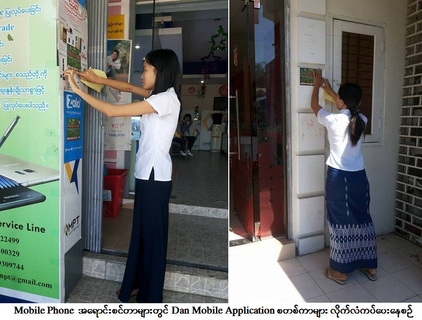ကယ်ဆယ်ရေးနှင့်ပြန်လည်နေရာချထားရေးဦးစီးဌာန၊ ပြည်ထောင်စုနယ်မြေတိုင်းဦးစီးမှူးရုံးမှ တာဝန်ရှိသူများသည် (၉-၁-၂၀၁၇) ရက်နေ့၌ ဇမ္ဗူ သီရိမြို့နယ်အတွင်းရှိ Mobile Phone အရောင်းစင်တာများတွင် ပြည်သူများ သဘာဝဘေး၊ မိုးလေဝသအခြေအနေနှင့် ကယ်ဆယ်ရေးသတင်း များ အချိန်နှင့်တပြေးညီ သိရှိနိုင်ရန်အတွက် DAN Mobile Application အသုံးပြုပုံ/အသုံးပြု နည်းလမ်းများအား လိုက်လံရှင်းပြခဲ့ပြီး စတစ်ကာများ ကပ်ပေးခြင်းတို့ကို ဆောင်ရွက်ပေးခဲ့ကြောင်း သတင်းရရှိပါသည်။