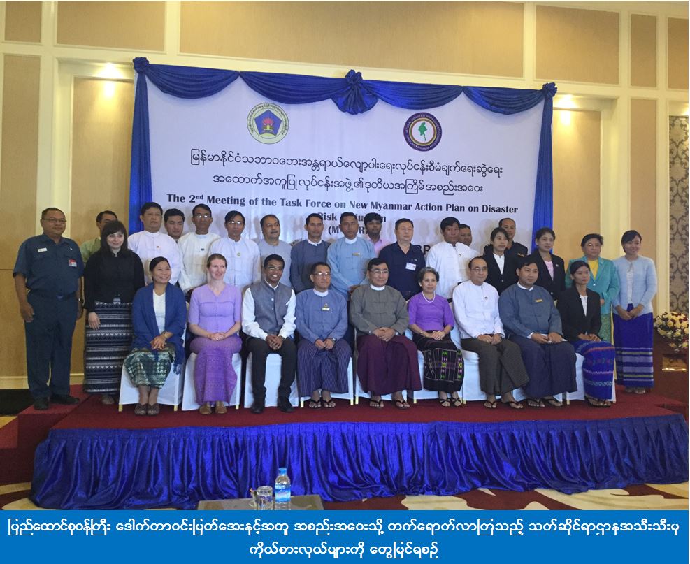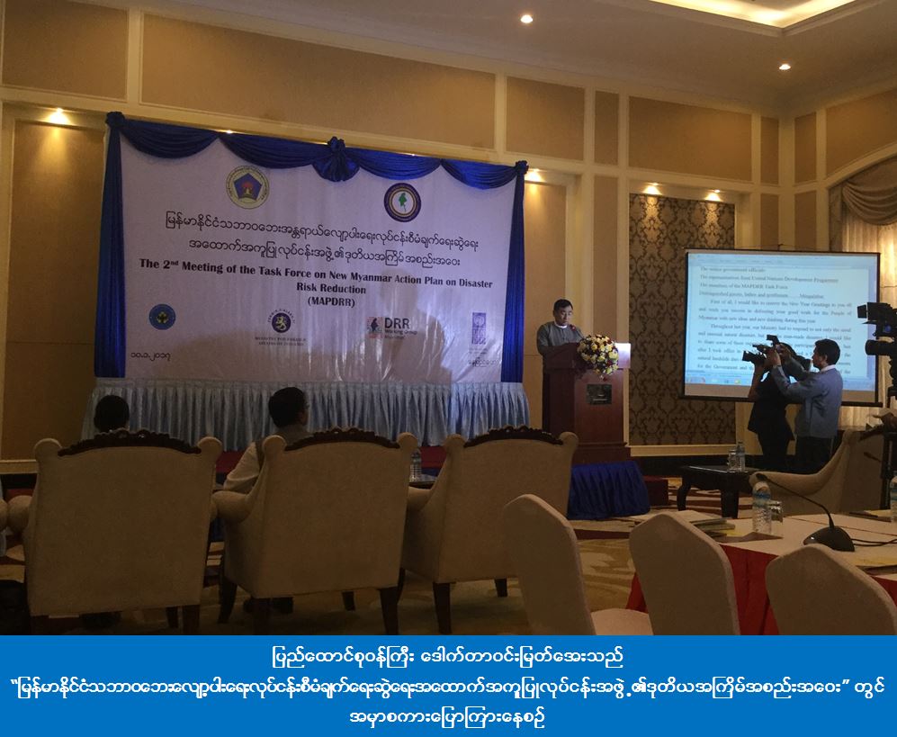 “မြန်မာနိုင်ငံသဘာဝဘေးလျော့ပါးရေးလုပ်ငန်းစီမံချက်ရေးဆွဲရေးအထောက်အကူပြုလုပ်ငန်းအဖွဲ့၏ဒုတိယအကြိမ်အစည်းအဝေး” ကို ၂၀၁၇ ခုနှစ်၊ ဇန်နဝါရီလ (၁၀) ရက်နေ့တွင် Grand Amara Hotel ၌ ကျင်းပပြုလုပ်ခဲ့ရာ လူမှုဝန်ထမ်း၊ ကယ်ဆယ်ရေးနှင့် ပြန်လည်နေရာချထားရေးဝန်ကြီးဌာန၊ ပြည်ထောင်စုဝန်ကြီး ဒေါက်တာဝင်းမြတ်အေး တက်ရောက်၍ ပြည်သူအတွက် အမှန်တကယ် အကျိုးရှိထိရောက်သည့် သဘာဝဘေးလျော့ပါးရေးလုပ်ငန်းစီမံချက်များရေးဆွဲနိုင်ရန်လိုအပ်ကြောင်း၊ လက်တွေ့အကောင်အထည်ဖော်နိုင်ရန်လည်း အရေးကြီးကြောင်း၊ ကမ္ဘာလုံးဆိုင်ရာအဆင့်ချမှတ်ထားသည့် အညွှန်းကိန်းများနှင့်လည်း ကိုက်ညီရန်လိုအပ်ကြောင်း၊ ယခင်က ဖြစ်ပွားခဲ့သောဘေးများအပေါ် အခြေခံပြီး ပိုမိုကောင်းမွန်သည့်လုပ်ငန်းစီမံချက်များကို ဖြစ်ရန်လိုအပ်ကြောင်း၊ သဘာဝဘေးလျော့ပါးရေးအတွက် လမ်းညွှန်မြေပုံဖြစ်လာနိုင်ရန်မျှော်လင့်ပါကြောင်းဖြင့် အဖွင့်အမှာစကားပြောကြားခဲ့ကြောင်း သိရှိရပါသည်။ အဆိုပါအစည်းအဝေးသို့ သက်ဆိုင်ရာဌာနအသီးသီးမှ ကိုယ်စားလှယ်များတက်ရောက်ခဲ့ကြကြောင်း သိရှိရပါသည်။
