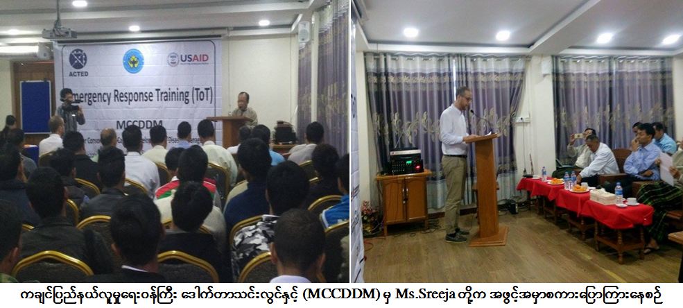 လူမှုဝန်ထမ်းကယ်ဆယ်ရေးနှင့်ပြန်လည်နေရာချထာရေးဝန်ကြီးဌာန ကချင်ပြည်နယ်အစိုးရအဖွဲ့နှင့် မြန်မာ့သဘာဝဘေးစီမံခန့်ခွဲမှုစွမ်းဆောင်ရည် ဖွံ့ဖြိုးတိုးတက်စေရေး ပူးပေါင်းအဖွဲ့ (MCCDDM) တို့ပူးပေါင်းဖွင့်လှစ်သော သဘာဝဘေးအန္တရာယ်ဆိုင်ရာ အရေးပေါ်တုံ့ပြန်ဆောင်ရွက်မှု နည်းပြသင်တန်းကို ကချင်ပြည်နယ် မြစ်ကြီးနားမြို့ မဒီရာဟိုတယ်တွင် (၉ -၁- ၂၀၁၇) ရက်နေ့ (၁ဝး၃၀) အချိန်တွင် ဖွင့်လှစ်ခဲ့ပြီး ကချင် ပြည်နယ် သဘာဝဘေးအန္တရာယ်ဆိုင်ရာစီမံခန့်ခွဲမှုကော်မတီဝင် ပြည်နယ်လူမှုရေးဝန်ကြီး ဒေါက်တာသင်းလွင်မှ အဖွင့်အမှာစကားပြောကြားပြီး ACTED MYANMAR အဖွဲ့အစည်း Mr.Mac သင်တန်းဖွင့်လှစ်ရခြင်းနှင့် စပ်လျဉ်း၍ ရှင်းလင်းပြောကြားခဲ့ပါသည်။ ထို့နောက် မြန်မာ့သဘာဝ ဘေးစီမံခန့်ခွဲမှုစွမ်းဆောင်ရည်ဖွံ့ဖြိုးတိုးတက်စေရေးပူးပေါင်းအဖွဲ့ (MCCDDM) မှ Ms.Sreeja က အမှာစကားပြောကြားခဲ့ပါသည်။ ထိုသင်တန်း ကို သင်တန်းသား (၃၇) ယောက်ဖြင့် (၉ -၁ -၂၀၁၇) ရက်နေ့ မှ (၂၀ -၁- ၂၀၁၇) ရက်နေ့ထိ မြန်မာ့သဘာဝဘေးစီမံခန့်ခွဲမှု စွမ်းဆောင်ရည်ဖွံ့ဖြိုး တိုးတက်စေရေးပူးပေါင်းအဖွဲ့ (MCCDDM) အဖွဲ့နှင့် ကယ်ဆယ်ရေးနှင့်ပြန်လည်နေရာချထားဦးစီးဌာနမှ နည်းပြများက ဆွေနွေးပို့ချသွားမည် ဖြစ်ကြောင်း သတင်းရရှိပါသည်။