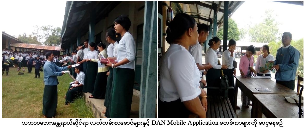 ဖျာပုံခရိုင်ကယ်ဆယ်ရေးရုံးမှ တာဝန်ရှိသူများသည် မီးသတ်ဦးစီးဌာနနှင့် ပူးပေါင်း၍ (၁၀-၁-၂၀၁၇) ရက်နေ့တွင် ဖျာပုံမြို့ အ.ထ.က (၂) ကျောင်း၌ ကျောင်းသား/သူများအား မီးဘေးနှင့် သဘာဝဘေးအန္တရာယ်ဆိုင်ရာများ အသိပညာပေးဆွေးနွေး၍ လက်ကမ်းစာစောင်များ နံရံကပ်ပိုစတာများ ဝေငှပေးခဲ့ပြီး သဘာဝဘေးအန္တရာယ်ကြိုတင်သတိပေး DAN Mobile Application ကို မိုဘိုင်းဖုန်းများတွင် ထည့်သွင်းအသုံးပြုပုံအား ရှင်းလင်းဆွေးနွေးခြင်းများ ဆောင်ရွက်ခဲ့ကြောင်း သတင်းရရှိပါသည်။