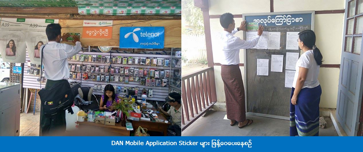 လူမှုဝန်ထမ်း၊ ကယ်ဆယ်ရေးနှင့် ပြန်လည်နေရာချထားရေးဝန်ကြီးဌာန ပြည်ထောင်စုဝန်ကြီး၏ ရက် ၁၀၀ အလွန်ဆောင်ရွက်မည့်စီမံကိန်းများအရ ကယ်ဆယ်ရေးနှင့် ပြန်လည်နေရာချထားရေးဦးစီးဌာနသရက်ခရိုင်ဦးစီးမှူးရုံးမှ တာဝန်ရှိသူများသည် (၁၀-၁-၂၀၁၇) ရက်နေ့တွင် သရက်ခရိုင်၊ အောင်လံမြို့ရှိ မိုဘိုင်းဖုန်းအရောင်းဆိုင်များ၌ သဘာဝဘေးအန္တရာယ်နှင့်စပ်လျဉ်းသည့် ပုံမှန်သတင်းများ အရေးကြီးမိုးလေဝသသတင်းများ အရေးပေါ်ဖုန်းနံပါတ်များ သဘာဝဘေးအန္တရာယ်ဆောင်ရန် ရှောင်ရန်အချက်များပါဝင်သည့်လက်ကမ်းစာစောင်များ ဘေးအန္တရာယ်နှင့်စပ်လျဉ်းသည့် ကြိုတင်သတိပေးချက်ပေးပို့သည့်စနစ်များပါဝင်သည့် DAN Mobile Application အကြောင်းရှင်းလင်းပြောကြားခြင်းနှင့် DAN Mobile Application Sticker များအား ဖြန့်ဝေခြင်းလုပ်ငန်းများကို ဆောင်ရွက်ခဲ့ပါကြောင်း သိရှိရပါသည်။