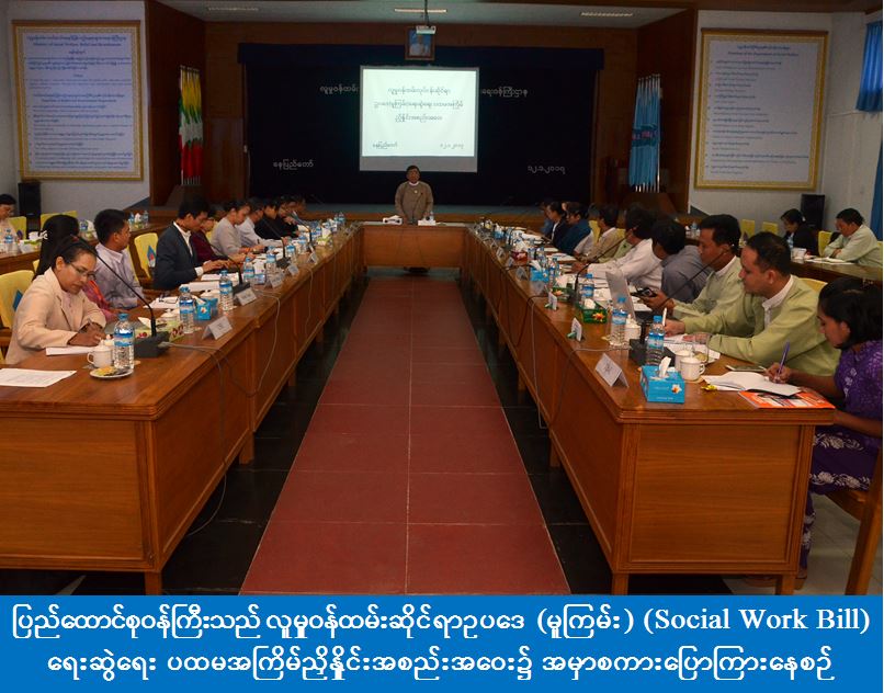 လူမှုဝန်ထမ်း၊ ကယ်ဆယ်ရေးနှင့် ပြန်လည်နေရာချထားရေးဝန်ကြီးဌာနသည် လူမှုဝန်ထမ်း လုပ်ငန်းဆိုင်ရာ တာဝန်ခံဝန်ကြီးဌာနဖြစ်သည်နှင့်အညီ လူမှုဝန်ထမ်းလုပ်ငန်းများအား သတ်မှတ်စံချိန်စံနှုန်းများ၊ ကျင့်ဝတ်များနှင့်အညီ ဆောင်ရွက်နိုင်ရေးအတွက် လူမှုဝန်ထမ်းဆိုင်ရာဥပဒေ (မူကြမ်း) (Social Work Bill) ရေးဆွဲရေး ပထမအကြိမ်ညှိနှိုင်းအစည်းအဝေးအား (၁၂.၁.၂၀၁၇) ရက်နေ့တွင် လူမှုဝန်ထမ်း၊ ကယ်ဆယ်ရေးနှင့် ပြန်လည်နေရာချထားရေးဝန််ကြီးဌာန၊ စုပေါင်းအစည်းအဝေးခန်းမ၌ ကျင်းပပြုလုပ်ခဲ့ပါသည်။