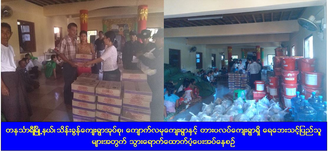 (၁၃.၁.၂၀၁၇) ရက်နေ့တွင် ကယ်ဆယ်ရေးနှင့်ပြန်လည်နေရာချထားရေးဦးစီးဌာန၊ တနင်္သာရီတိုင်းဒေသကြီးဦးစီးမှူးရုံးနှင့် မြိတ်ခရိုင်ဦးစီးမှူးရုံးတို့မှ တာဝန်ရှိသူများသည် ရေဘေးသင့်ဒေသဖြစ်သော တနင်္သာရီမြို့နယ်၊ သိန်းခွန်ကျေးရွာအုပ်စု၊ ကျောက်လမုကျေးရွာနှင့် တားပလပ်ကျေးရွာတို့မှ ရေဘေးသင့်ပြည်သူ စုစုပေါင်း (၆၈၀)ဦးအတွက် ခေါက်ဆွဲခြောက် (၂၀၄၀)ထုပ်၊ ကြက်ဥ(၂၀၄၀)လုံး၊ ထပ်တိုးအိမ်ထောင်စု (၃၁)စုစာအတွက် ကယ်ဆယ်ရေးပစ္စည်း (၄)မျိုးနှင့် ဆန်ရိက္ခာဖိုး (၇)ရက်စာ ငွေ (၅၀၁,၉၀၀/-)ကျပ် တို့ကို ရေဘေးကယ်ဆယ်ရေးစခန်းဖွင့်လှစ်ထားသော ချောင်းလမုကျေးရွာဘုန်းတော်ကြီးကျောင်းသို့ သွားရောက် ထောက်ပံ့ပေးခဲ့ကြောင်း သတင်းရရှိပါသည်။