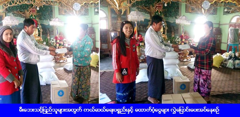 ကယ်ဆယ်ရေးနှင့် ပြန်လည်နေရာချထားရေးဦးစီးဌာန၊ ကချင်ပြည်နယ်ဦးစီးမှူးရုံးမှ တာဝန်ရှိသူများ သည် ကချင်ပြည်နယ်၊ မိုးကောင်းမြို့နယ်၊ အရှေ့ရပ်ကွက်၊ အောက်ချိုင့်တွင် (၁၈-၁-၂၀၁၇) ရက်၊ (၀၉:၃၀) အချိန်၌ ဖြစ်ပွားခဲ့သော မီးဘေးသင့်အိမ်ထောင်စု (၄) စုမှ လူဦးရေ (၂၀) ဦးတို့အတွက် ကယ်ဆယ်ရေးပစ္စည်း (၉) မျိုး၊ ဆန်ရိက္ခာဖိုးငွေ (၁၈,၀၀၀) ကျပ်နှင့် အိမ်ဆောက်ပစ္စည်းဖိုးငွေ (၄၀၀,၀၀၀) ကျပ်တို့အား (၁၉-၁-၂၀၁၇) ရက်နေ့၊ (၁၃:၀၀) အချိန်တွင် သွားရောက်ထောက်ပံ့ပေးအပ်ခဲ့ကြောင်း သတင်းရရှိပါသည်။