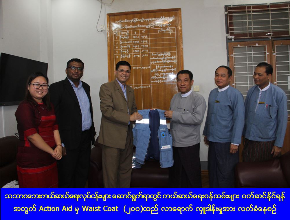 သဘာဝဘေးကယ်ဆယ်ရေးလုပ်ငန်းများ ဆောင်ရွက်ရာတွင် ကယ်ဆယ်ရေးဝန်ထမ်းများ ဝတ်ဆင်နိုင်ရန်အတွက် Action Aid မှ Waist Coat (၂၀၀)ထည်အား (၂၃-၁-၂၀၁၇)ရက်နေ့ (၁၅:၀၀)နာရီအချိန်တွင် ကယ်ဆယ်ရေးနှင့်ပြန်လည်နေရာချထားရေးဦးစီးဌာန၊ ရုံးအမှတ်(၂၃)၊ နေပြည်တော်သို့ လာရောက် လှူဒါန်းခဲ့ရာ ညွှန်ကြားရေးမှူးချုပ်၊ ကယ်ဆယ်ရေးနှင့်ပြန်လည်နေရာချထားရေးဦးစီးဌာနမှ လက်ခံရယူခဲ့ကြောင်း သတင်းရရှိပါသည်။