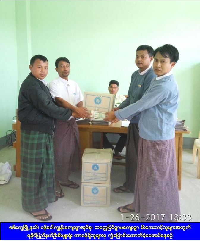 စစ်တွေမြို့နယ်၊ ဂန့်ဂေါ်ကျွန်းကျေးရွာအုပ်စု သက္ကေပြင်ကျေးရွာတွင် ( ၂၀ – ၁ – ၂၀၁၇ ) ရက်နေ့၌ မီးလောင်မှုကြောင့် မီးဘေးသင့်အိမ်ခြေ(၃)လုံးမှ အိမ်ထောင်စု( ၃ )စု လူဦးရေစုစုပေါင်း(၁၆)ဦးအတွက် ကယ်ဆယ်ရေးပစ္စည်း(၉)မျိုး၊ ဆန်ရိက္ခာ(၃) ရက်စာဖိုး(၁၄,၄၀၀/-)ကျပ်နှင့် အိမ်ဆောက်ပစ္စည်းဖိုး(၁၅၀,၀၀၀/-)ကျပ်တို့အား ရခိုင်ပြည်နယ်ဦးစီးမှူးရုံးတာဝန်ရှိသူများမှ (၂၆-၁-၂၀၁၇)ရက်နေ့တွင် ထောက်ပံ့ပေးခဲ့ကြောင်း သတင်းရရှိပါသည်။