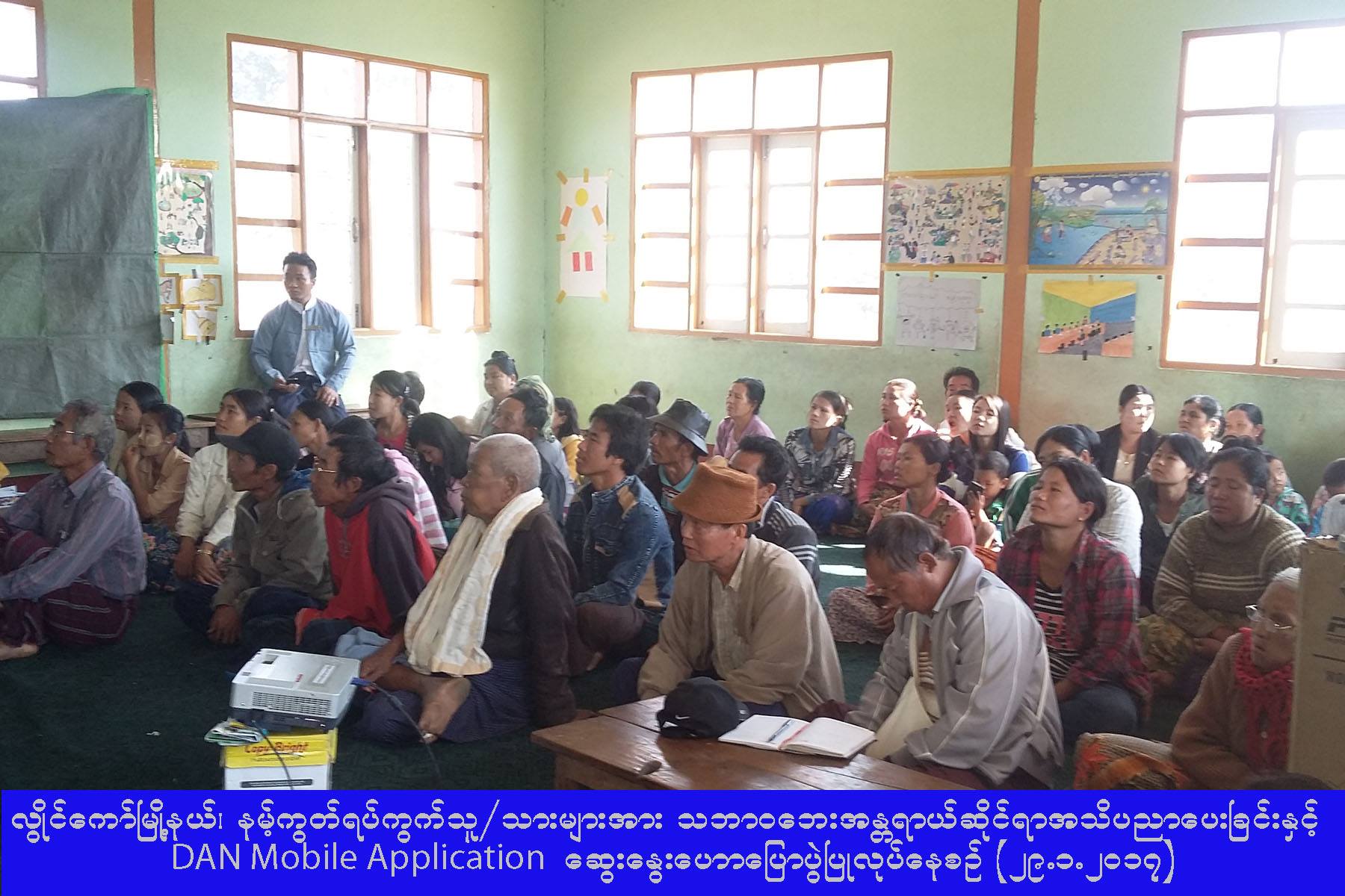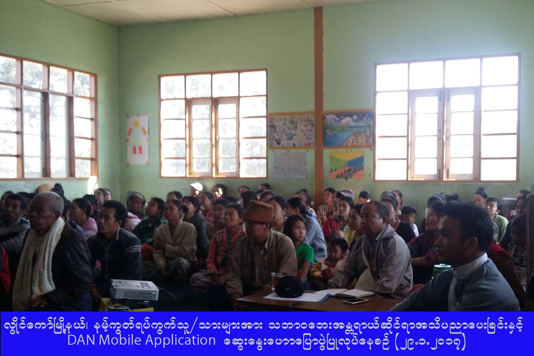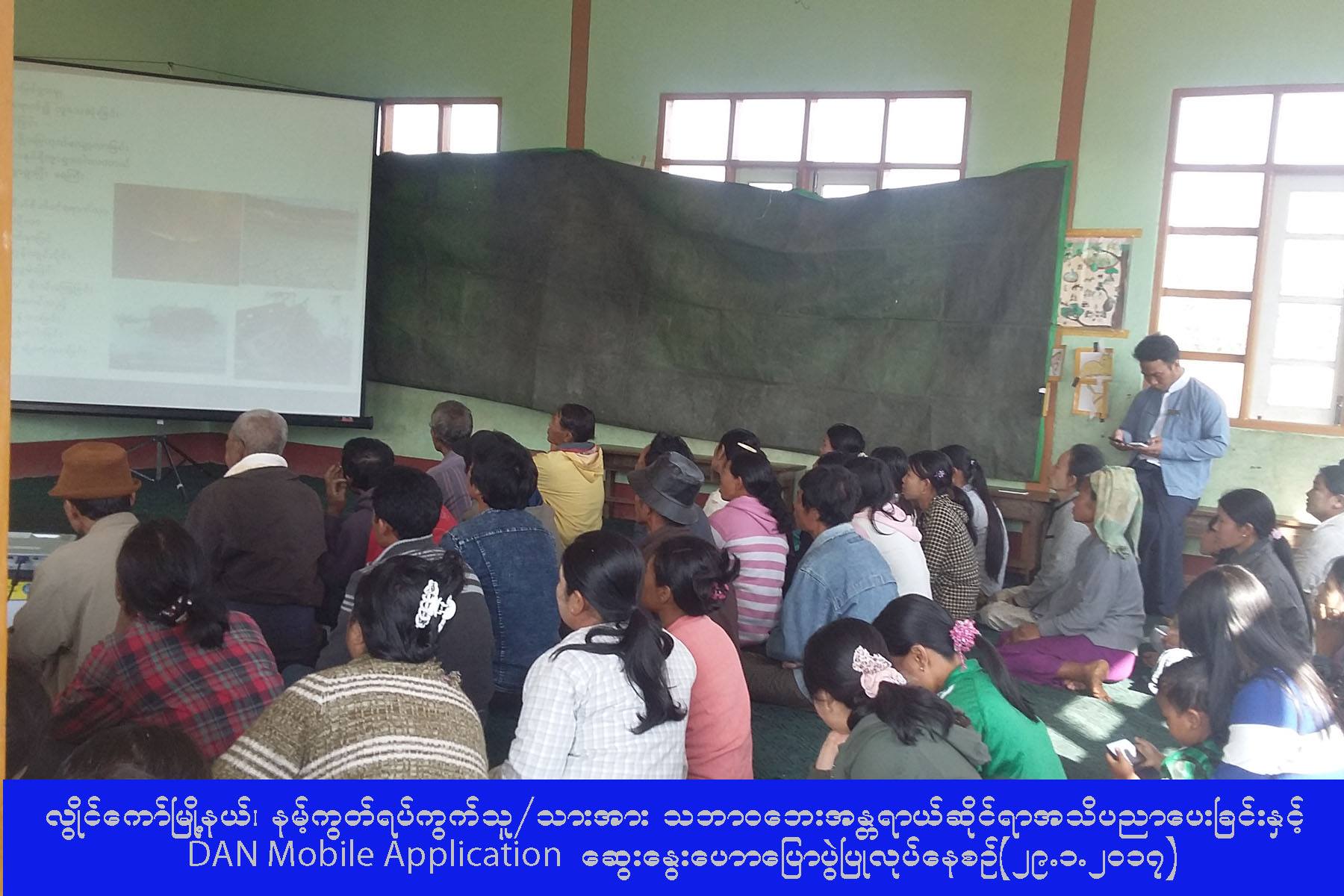 ကယားပြည်နယ်ဦးစီးမှူးရုံးမှ ဝန်ထမ်းများသည် (၂၉.၁.၂၀၁၇)ရက်နေ့၌ နံနက်(၉:၀၀)နာရီမှ (၁၀:၃၀)နာရီအချိန်အထိ လွိုင်ကော်မြို့နယ်၊ နမ့်ကွတ်ရပ်ကွက်တွင် သဘာ၀ဘေးဆိုင်ရာအသိပညာပေးခြင်းနှင့် DAN Mobile Application အကြောင်း ဆွေးနွေးဟောပြောပေးခဲ့ရာ နမ့်ကွတ်ရပ်ကွက်တွင် နေထိုင်သူ ရပ်ကွက်သူ/သား စုစုပေါင်းအင်အား (၁၃၀)ဦး တက်ရောက်ခဲ့ကြောင်း သတင်းရရှိပါသည်။
