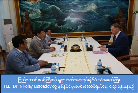 လူမှုဝန်ထမ်း၊ ကယ်ဆယ်ရေးနှင့်ပြန်လည်နေရာချထားရေးဝန်ကြီးဌာန၊ ပြည်ထောင်စုဝန်ကြီး ဒေါက်တာဝင်းမြတ်အေးအားယနေ့နံနက် (၉)နာရီတွင် ရုရှားဖက်ဒရေးရှင်းနိုင်ငံ သံအမတ်ကြီး H.E. Dr. Nikolay Listoadov မှ အဆိုပါဝန်ကြီးရုံးမေခလာခန်းမ၌ လာရောက်တွေ့ဆုံခဲ့ပါသည်။