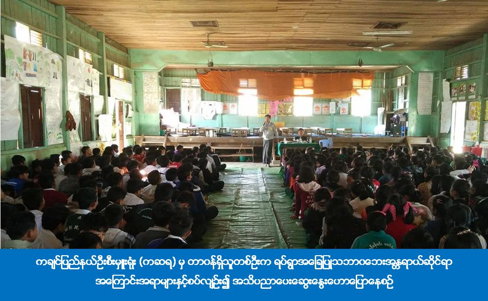 ကချင်ပြည်နယ်ဦးစီးမှူးရုံး (ကဆရ) မှ တာဝန်ရှိသူများသည် (၃၀-၁-၂၀၁၇) ရက်နေ့တွင် ကချင်ပြည်နယ်၊ ဖားကန့်မြို့နယ်၊ လုံးခင်းကျေးရွာ၊ အခြေခံပညာအထက်တန်းကျောင်းရှိ စိမ်းလဲ့မြိုင်ခန်းမ၌ ရပ်ရွာအခြေပြုသဘာဝဘေးအန္တရာယ်ဆိုင်ရာ အသိပညာပေးဆွေးနွေးဟောပြောပွဲ ကျင်းပပြုလုပ်ခဲ့ရာ ကျောင်းသား၊ ကျောင်းသူ (၃၀၀) ဦး တက်ရောက်ခဲ့ပါသည်။ ဆက်လက်၍ ဖားကန့်မြို့ရှိ သဘာဝဘေးလျော့ပါးရေးစေတနာ့ဝန်ထမ်းလူငယ်များက အဆိုပါကျောင်းရှိ ဆရာ၊ ဆရာမများကို DAN Mobile Application အသုံးပြုပုံနည်းလမ်းများအား အသိပညာပေးမျှဝေပေးခဲ့ကြောင်းသိရှိရပါသည်။