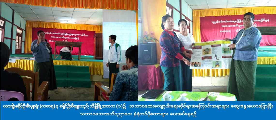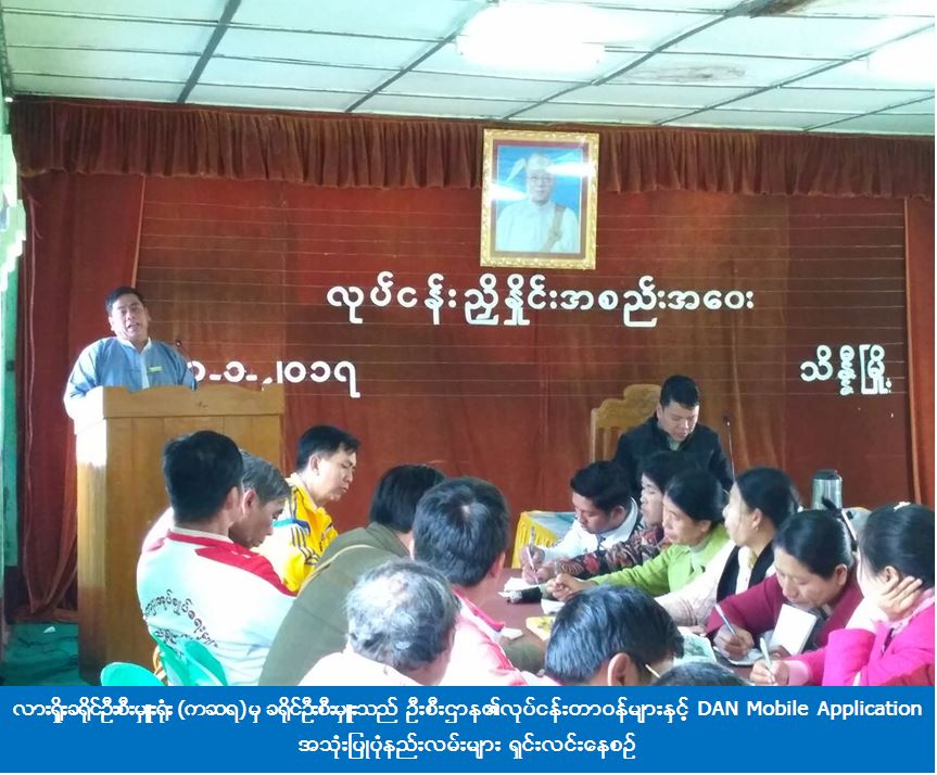 လားရှိုးခရိုင်ဦးစီးမှူးရုံး (ကဆရ) မှ တာဝန်ရှိသူများသည် (၃၁-၁-၂၀၁၇) ရက်နေ့၊ နံနက်ပိုင်းတွင် သိန္နီမြို့နယ်အထွေထွေအုပ်ချုပ်ရေးဦးစီးဌာနအစည်းအဝေးခန်းမ၌ မြို့နယ်အုပ်ချုပ်ရေးမှူး၊ ရပ်/ကျေးအုပ်ချုပ်ရေးမှူးများနှင့် ရပ်/ကျေးစာရေးများ စုစုပေါင်း (၇၅) ဦးကို ဦးစီးဌာန၏လုပ်ငန်းတာဝန်များနှင့် DAN Mobile Application အသုံးပြုပုံနည်းလမ်းများအား ရှင်းလင်းဖြန့်ဝေခဲ့ပါသည်။ ထို့နောက် နေ့လည် (၁) နာရီမှ (၂) နာရီထိ သိန္နီမြို့အထက (၁) ၌ သဘာဝဘေးလျော့ပါးရေးဆိုင်ရာအသိပညာပေးဟောပြောပွဲကို ဆက်လက်ကျင်းပပြုလုပ်ခဲ့ရာ ဆရာ၊ ဆရာမများနှင့် ကျောင်းသား၊ ကျောင်းသူ (၃၀၀) ဦးခန့်တက်ရောက်ခဲ့ကြောင်း သိရှိရပါသည်။