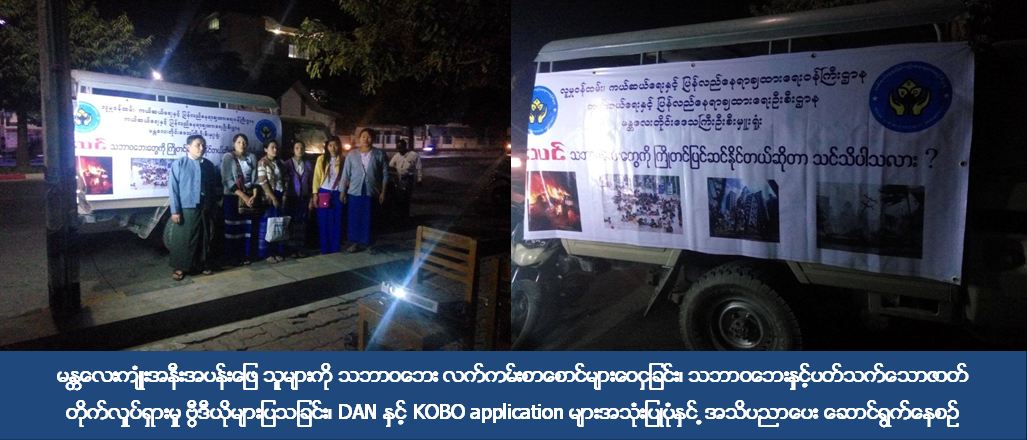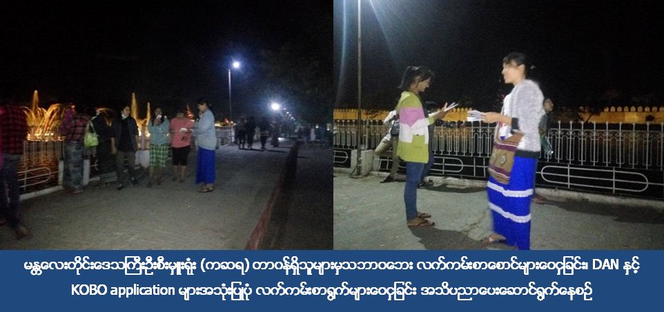 မန္တလေးတိုင်းဒေသကြီးဦးစီးမှူးရုံးတာဝန်ရှိသူများသည် (၃၀-၁-၂၀၁၇) ရက်ညပိုင်းတွင် မန္တလေးကျုံးအနီးအပန်းဖြေ သူများကို သဘာဝဘေး လက်ကမ်းစာစောင်များဝေငှခြင်း၊သဘာဝဘေးနှင့်ပတ်သက်သော ဇာတ်တိုက်လှုပ်ရှားမှု ဗွီဒီယိုများပြသခြင်း၊ DAN နှင့် KOBO application များအသုံးပြုပုံ လက်ကမ်းစာစောင်များ ဝေငှခြင်းတို့ဆောင်ရွက်ခဲ့ပါသည်။