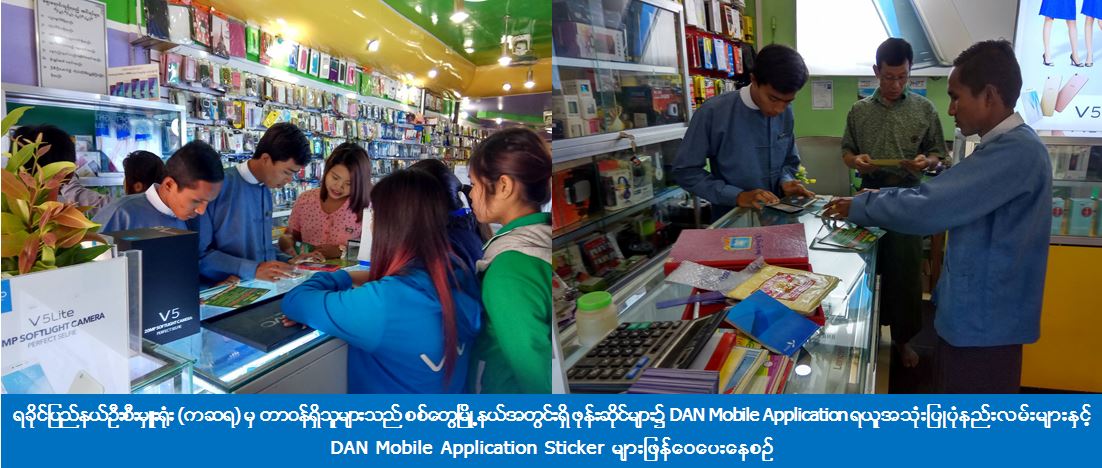 (၇-၂-၂၀၁၇) ရက်နေ့၊ (၁၁:ဝ၀) နာရီအချိန်တွင် ရခိုင်ပြည်နယ်ဦးစီးမှူးရုံး (ကဆရ) မှ ပြည်နယ်ဦးစီးမှူးနှင့် တာဝန်ရှိသူများသည် စစ်တွေမြို့နယ်အတွင်းရှိ ဖုန်းဆိုင်များ၌ DAN Mobile Application ရယူအသုံးပြုပုံနည်းလမ်းများနှင့် DAN Mobile Application Sticker များဖြန့်ဝေပေးလျက်ရှိကြောင်း သိရှိရပါသည်။
