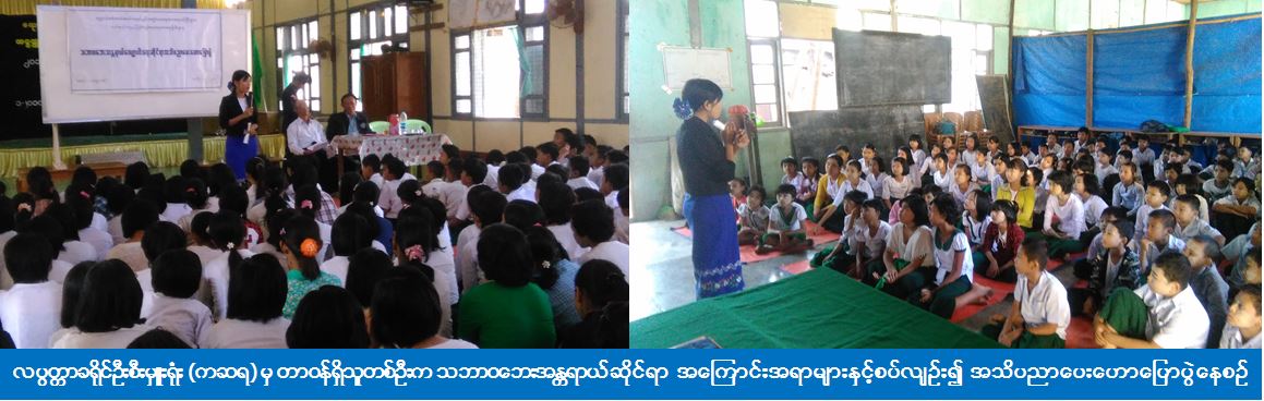 လပွတ္တာခရိုင်ဦးစီးမှူးရုံး (ကဆရ) မှ တာဝန်ရှိသူများသည် လပွတ္တာမြို့၊ စားသုံးသူရေးရာဦးစီးဌာန၊ မီးသတ်ဦးစီးဌာနတို့နှင့်ပူးပေါင်း၍ (၃-၂-၂၀၁၇ ) ရက်နေ့တွင် အမှတ် (၄) အခြေခံပညာမူလတန်းလွန်ကျောင်းနှင့် အမှတ် (၂) အခြေခံပညာအထက်တန်းကျောင်းတို့၌ သဘာဝဘေးအန္တရာယ်ဆိုင်ရာ အသိပညာပေးဟောပြောပွဲများ ကျင်းပပြုလုပ်ခဲ့ရာ အမှတ် (၄) အခြေခံပညာမူလတန်းလွန်ကျောင်းမှ ဆရာ/ဆရာမနှင့် ကျောင်းသား/ ကျောင်းသူစုစုပေါင်း (၁၀၈) ဦး၊ အမှတ် (၂) အခြေခံပညာအထက်တန်းကျောင်းမှ ဆရာ/ဆရာမနှင့် ကျောင်းသား/ ကျောင်းသူစုစုပေါင်း (၃၀၆) ဦးတက်ရောက်ခဲ့ကြောင်း သိရှိရပါသည်။