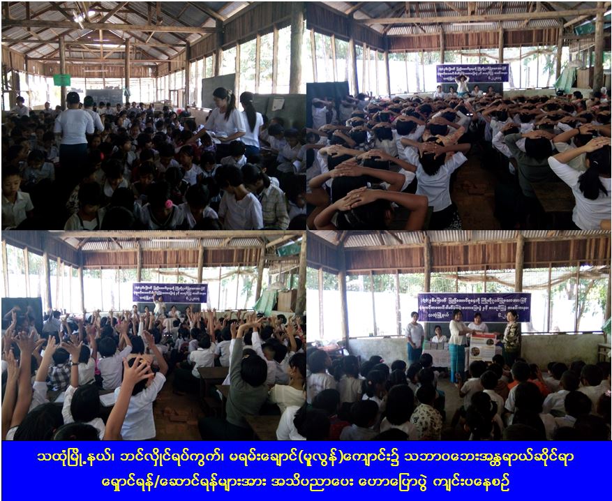 (၆-၂-၂၀၁၇)ရက်နေ့နံနက်ပိုင်းတွင် လူမှုဝန်ထမ်း၊ ကယ်ဆယ်ရေးနှင့်ပြန်လည်နေရာချထားရေးဝန်ကြီးဌာန၊ ကယ်ဆယ်ရေးနှင့် ပြန်လည်နေရာချရေးဦးစီးဌာန၊ သထုံခရိုင်ဦးစီးမှူးရုံးမှ တာဝန်ရှိသူများသည် သထုံခရိုင် ပြန်ကြားရေးနှင့် ပြည်သူ့ဆက်ဆံရေး ဦးစီးဌာနနှင့်ပူးပေါင်း၍ သထုံမြို့နယ်၊ ဘင်လှိုင်ရပ်ကွက်၊ မရမ်းချောင်(မူလွန်)ကျောင်း၌ သဘာဝဘေးအန္တရာယ်ဆိုင်ရာ ရှောင်ရန်/ဆောင်ရန်များအား အသိပညာပေး ဟောပြောပေးခဲ့ရာ ကျောင်းသား/ကျောင်းသူ (၂၃၁)ဦး တက်ရောက်ခဲ့ပြီး သဘာဝဘေးပညာပေး လက်ကမ်းစာစောင်များအား ဝေငှပေးခြင်းနှင့် ဘေးမျိုးစုံပါပိုစတာများ ဖြန့်ဝေပေးခဲ့ကြောင်း သတင်းရရှိပါသည်။
