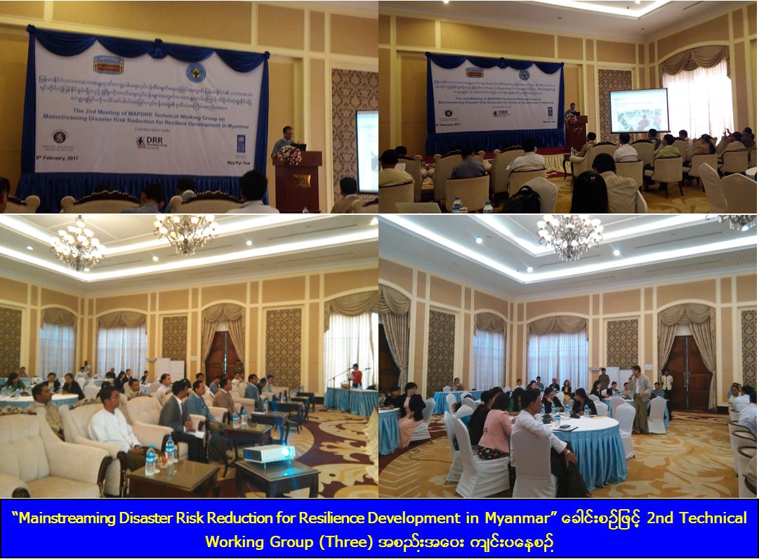 စီမံကိန်းရေးဆွဲရေးဦးစီးဌာန၊ ကယ်ဆယ်ရေးနှင့် ပြန်လည်နေရာချထားရေးဦးစီးဌာနနှင့် UNDP တို့ပူးပေါင်း၍ (၈-၂-၂၀၁၇) ရက်နေ့တွင် “Mainstreaming Disaster Risk Reduction for Resilience Development in Myanmar” ခေါင်းစဉ်ဖြင့် 2nd Technical Working Group (Three) အစည်းအဝေးကို Grand Amara Hotel၊ နေပြည်တော်၌ ကျင်းပပြုလုပ်ရာ စီမံကိန်းရေးဆွဲရေးဦးစီးဌာနမှ တာဝန်ရှိသူများ၊ ကယ်ဆယ်ရေးနှင့် ပြန်လည်နေရာချထားရေးဦးစီးဌာနမှ တာဝန်ရှိသူများနှင့် သက်ဆိုင်ရာဌာနများမှ တာဝန်ရှိသူများ တက်ရောက်ခဲ့ကြောင်း သိရှိရပါသည်။