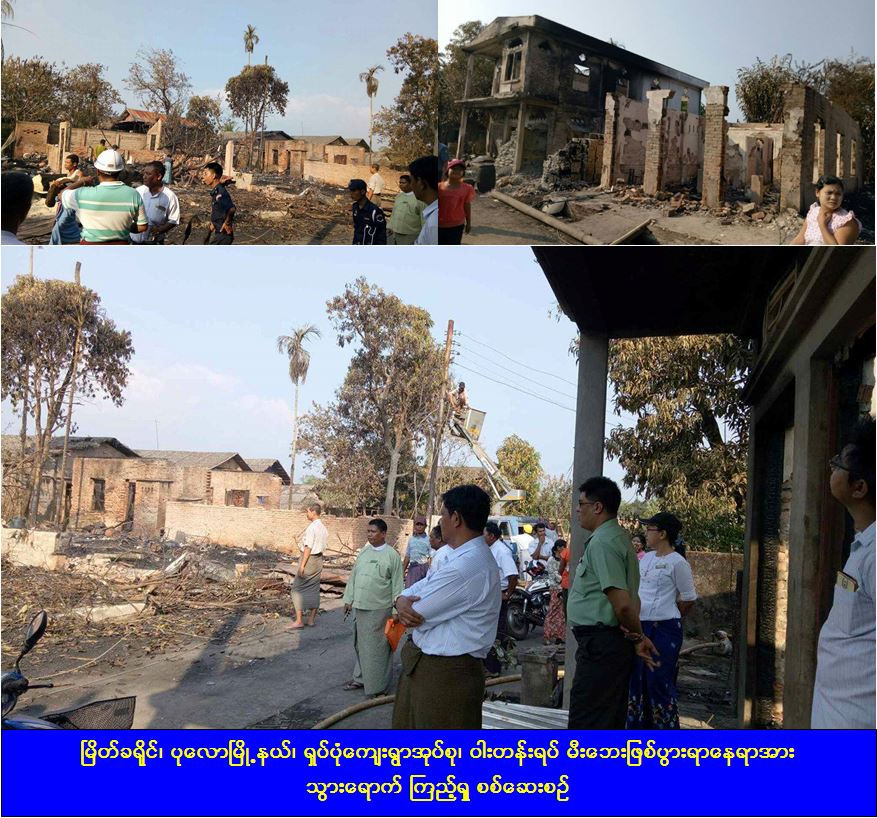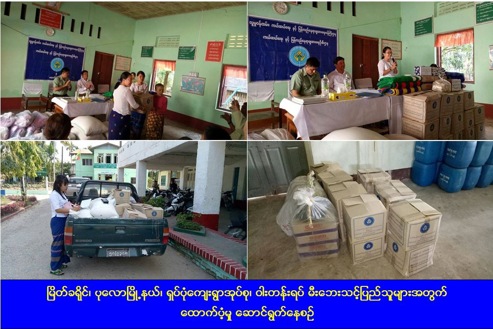 (၉-၂-၂၀၁၇)ရက်နေ့ (၂၂:၄၅) နာရီအချိန်တွင် မြိတ်ခရိုင်၊ ပုလောမြို့နယ်၊ ရှပ်ပုံကျေးရွာအုပ်စု၊ ဝါးတန်းရပ်တွင် ဖြစ်ပွားသည့် မီးဘေးသင့်အိမ်ခြေ (၁၃)လုံး အနက်မှ တိုက်အိမ် (၈)လုံးအတွက် အိမ် (၁)လုံးလျှင် အိမ်ဆောက်ပစ္စည်းဖိုးငွေ(၂၀၀,၀၀၀/-)ကျပ်နှုန်းဖြင့် ငွေ (၁,၆၀၀,၀၀၀/-)ကျပ်၊ ဓနိမိုး ထရံကာ အိမ် (၅)လုံးအတွက် အိမ်(၁)လုံးလျှင် အိမ်ဆောက်ပစ္စည်းဖိုးငွေ (၅၀,၀၀၀/-)ကျပ်နှုန်းဖြင့် ငွေ (၂၅၀,၀၀၀/-)ကျပ်၊ စုစုပေါင်း အိမ်ဆောက်ပစ္စည်းဖိုးငွေ (၁,၈၅၀,၀၀၀/-)ကျပ်နှင့် ဖြိုဖျက်အိမ်(၂၆)လုံးအတွက် အိမ် (၁)လုံးလျှင် အိမ်ဆောက်ပစ္စည်းဖိုးငွေ (၂၀,၀၀၀/-)ကျပ်နှုန်းဖြင့် ငွေ (၅၂၀,၀၀၀/-)ကျပ်နှင့် မီးဘေးသင့် အိမ်ထောင်စု (၁၄)စုအတွက် ကယ်ဆယ်ရေးပစ္စည်း (၉)မျိုး၊ မီးဘေးသင့်သူ စုစုပေါင်း (၆၆)ဦးအတွက် ဆန်ရိက္ခာဖိုး(၇)ရက်စာ ထောက်ပံ့ငွေ (၁၃၈,၆၀၀/-)ကျပ်၊ ခေါက်ဆွဲခြောက် (၁)ဦးလျှင် ၂ထုပ်ကျ (၁)ထုပ်လျှင်ငွေ (၁၃၀/-)ကျပ်နှုန်းဖြင့် စုစုပေါင်း ထောက်ပံ့ငွေ (၁၇,၁၆၀/-)ကျပ်၊ မီးဘေးသင့်သူ ကလေး (၁၇)ဦးအတွက် မုန့်သရေစာ (၃၆၀၀/-) ကျပ်ဖိုးစသည်ဖြင့် ထောက်ပံ့ငွေစုစုပေါင်း(၂,၅၂၉,၃၆၀/-)ကျပ်အား (၁၀-၂-၂၀၁၇) ရက်နေ့တွင် ကယ်ဆယ်ရေးနှင့် ပြန်လည်နေရာချထားရေးဦးစီးဌာန၊ တနင်္သာရီတိုင်းဒေသကြီးဦးစီးမှူးရုံးနှင့် မြိတ်ခရိုင်ဦးစီးမှူးရုံး တာဝန်ရှိသူများမှ ထောက်ပံ့ပေးအပ်ခဲ့ကြောင်း သတင်းရရှိပါသည်။