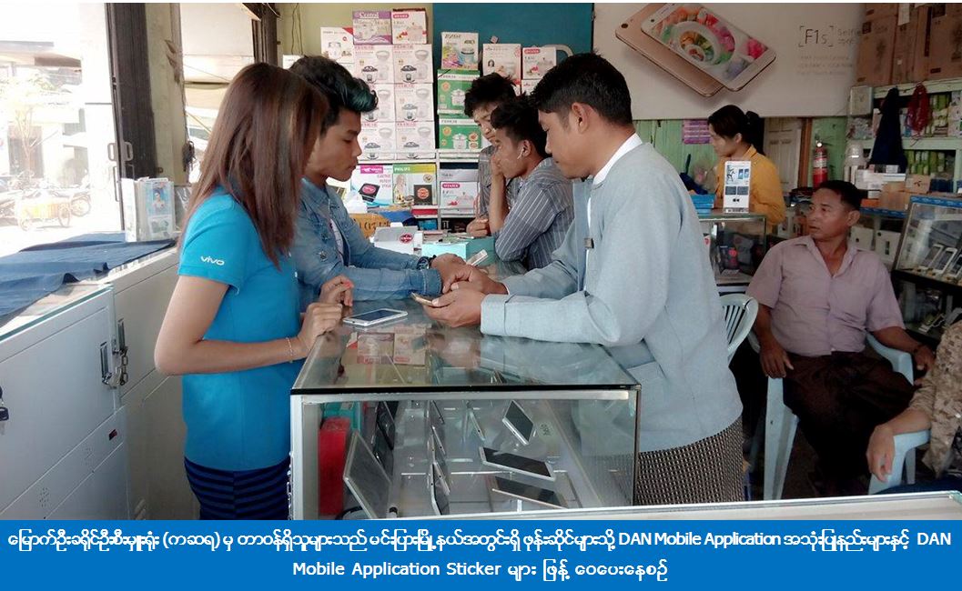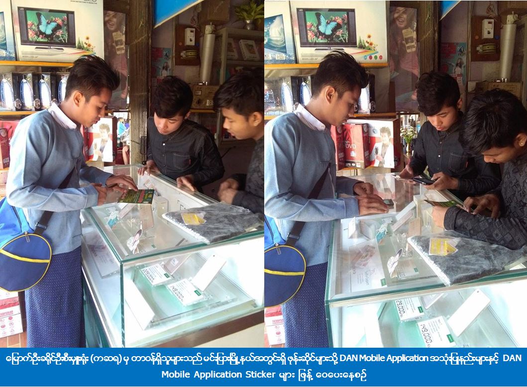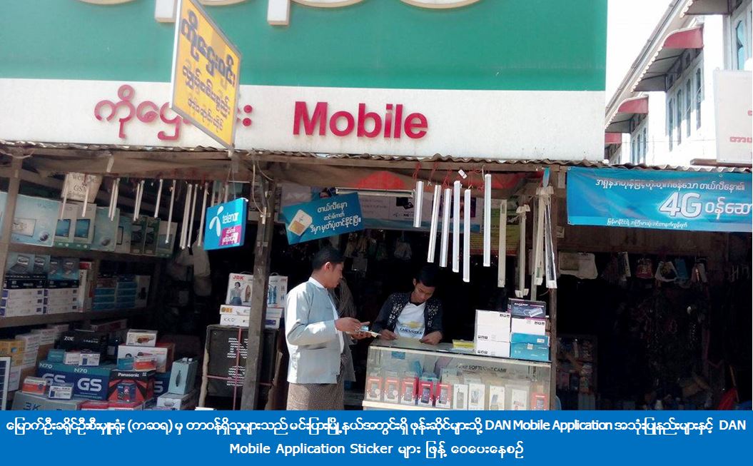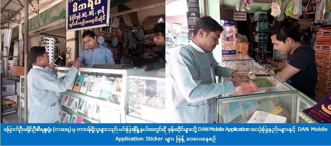 (၈-၂-၁၀၁၇) ရက်နေ့နှင့် (၁၄-၂-၂၀၁၇) ရက်နေ့တို့တွင် မြောက်ဦးခရိုင်ဦးစီးမှူးရုံး (ကဆရ) မှ တာဝန်ရှိသူများသည် မြောက်ဦးခရိုင်၊ မင်းပြားမြို့နယ်အတွင်းရှိ ဖုန်းဆိုင်များသို့ သွားရောက်ကာ ပြည်သူများအနေဖြင့် သဘာဝဘေးနှင့်စပ်လျဉ်းသည့်ပုံမှန်သတင်းများ၊ အရေးကြီးသတင်းများ၊ မိုးလေဝသသတင်းများနှင့် မြန်မာနိုင်ငံအတွင်း သဘာဝဘေးအန္တရာယ်လျော့ပါးရေးဆောင်ရွက်ချက်သတင်းများကို အချိန်နှင့်တပြေးညီသိရှိနိုင်ရန်၊ ဖြစ်ပေါ်လာနိုင်သည့်ဘေးအန္တရာယ်နှင့်စပ်လျဉ်းသည့် ကြိုတင်သတိပေး Message များ ရရှိနိုင်ရန်၊ အရေးကြီးဖုန်းနံပါတ်များနှင့် သဘာဝဘေးအန္တရာယ်ဆိုင်ရာ ဆောင်ရန်၊ ရှောင်ရန် ပညာပေးလက်ကမ်းစာစောင်များလေ့လာသိရှိဆောင်ရွက်နိုင်စေရန် စသည်တို့ပါဝင်သည့် DAN Mobile Application အသုံးပြုပုံနည်းလမ်းများနှင့် DAN Mobile Application Sticker များဖြန့်ဝေပေးခဲ့ကြောင်း သိရှိရပါသည်။