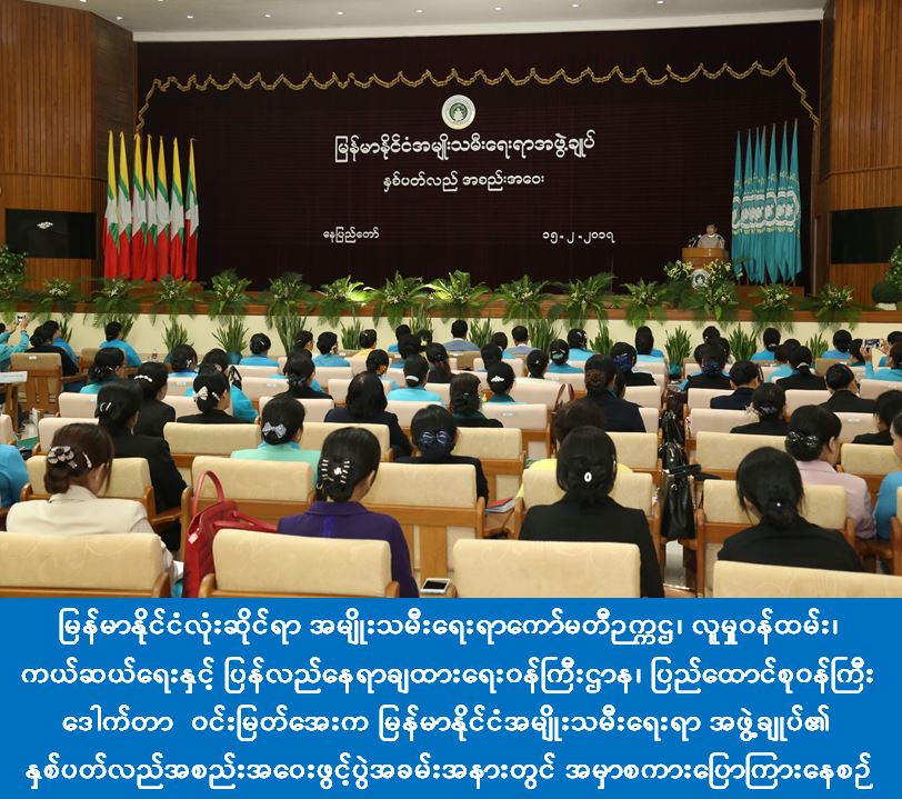 မြန်မာနိုင်ငံလုံးဆိုင်ရာ အမျိုးသမီးရေးရာကော်မတီ (Myanmar National Committee For Women Affairs – MNCWA) ကို ပြည်သူ့အစိုးရအဖွဲ့သစ်၏ မူဝါဒများနှင့်အညီ ၂၀၁၆ခုနှစ်တွင် အသစ်ပြန်လည်ဖွဲ့စည်းခဲ့ပြီး လူမှု၀န်ထမ်း၊ ကယ်ဆယ်ရေးနှင့် ပြန်လည်နေရာချထားရေး၀န်ကြီးဌာန၊ ပြည်ထောင်စု၀န်ကြီးက ဉက္ကဌအဖြစ်ဆောင်ရွက်လျက်ရှိပါကြောင်း၊ ကော်မတီတွင် အမျိုးသမီးများ၏ အခွင့်အရေးနှင့် ဖွံ့ဖြိုးတိုးတက်ရေးလုပ်ငန်းများကို တက်ကြွစွာပါ၀င်ဆောင် ရွက်လျက်ရှိသော ရပ်ရွာအခြေပြုအဖွဲ့အစည်းများကိုလည်း ပါ၀င်ဖွဲ့စည်းထားရှိပါကြောင်း၊ အဆိုပါအဖွဲ့အစည်းများတွင် မြန်မာနိုင်ငံ အမျိုးသမီးရေးရာအဖွဲ့ချုပ်သည်လည်း တစ်ခုအပါအ၀င်ဖြစ်ပါကြောင်း (၁၅-၂-၂၀၁၇) ရက်နေ့၊ နံနက်ပိုင်းက နေပြည်တော်၊ မြန်မာနိုင်ငံအမျိုးသမီးရေးရာ အဖွဲ့ချုပ်၊ အစည်းအဝေးခန်းမ၌ ကျင်းပပြုလုပ်သည့် အဆိုပါအဖွဲ့ချုပ်၏ နှစ်ပတ်လည်အစည်းအဝေးဖွင့်ပွဲအခမ်းအနားတွင် မြန်မာနိုင်ငံလုံးဆိုင်ရာ အမျိုးသမီးရေးရာကော်မတီဉက္ကဌ၊ လူမှု၀န်ထမ်း၊ ကယ်ဆယ်ရေးနှင့် ပြန်လည်နေရာချထားရေး ၀န်ကြီးဌာန၊ ပြည်ထောင်စု၀န်ကြီး ဒေါက်တာ ၀င်းမြတ်အေးက ပြောကြားခဲ့ပါသည်။