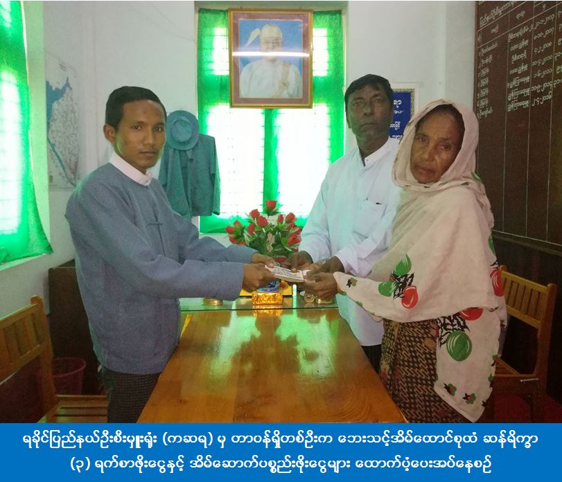 (၁၄-၂-၂၀၁၇) ရက်နေ့တွင် ရခိုင်ပြည်နယ်၊ စစ်တွေမြို့နယ်၊ ဆေးသမားကျေးရွာအုပ်စု၊ အုန်းတောပြီးကျေးရွာ၌ မီးလောင်မှုဖြစ်ပွားခဲ့ရာ မီးဘေးသင့်ခဲ့သည့် အိမ်ထောင်စု (၁) စုစာအတွက် ကယ်ဆယ်ရေးပစ္စည်း (၉) မျိုး (၁) အိမ်ထောင်စာ၊ ဆန်ရိက္ခာ (၃) ရက်စာဖိုးငွေ (၄၅၀၀) ကျပ်နှင့် အိမ်ဆောက်ပစ္စည်းဖိုးငွေ (၅၀၀၀၀) ကျပ်တိတိတို့အား ရခိုင်ပြည်နယ်ဦးစီးမှူးရုံး (ကဆရ) မှ တာဝန်ရှိသူများက (၁၅-၂-၂၀၁၇) ရက်နေ့တွင် ဘေးသင့်အိမ်ထောင်စုထံ ထောက်ပံ့ပေးခဲ့ကြောင်း သိရှိရပါသည်။