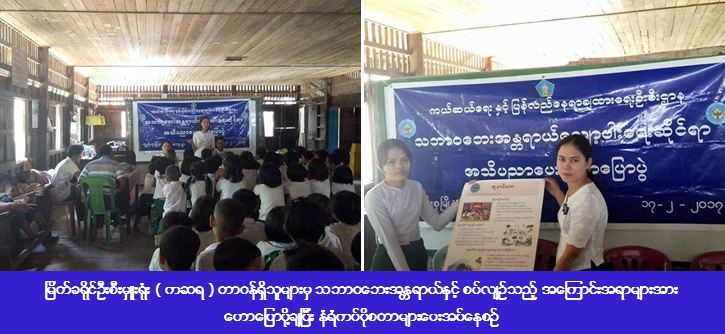ကယ်ဆယ်ရေးနှင့်ပြန်လည်နေရာချထားရေးဦးစီးဌာန၊ မြိတ်ခရိုင်ဦးစီးမှူးရုံးမှ တာဝန်ရှိသူများသည် (၁၇-၂-၂၀၁၇) ရက်နေ့တွင် မြိတ်ခရိုင်၊ ကျွန်းစုမြို့နယ်၊ ကပကျေးရွာ၊ အ.မ.က ကျောင်းတွင် သဘာဝဘေးအန္တရာယ်နှင့် ပတ်သက်သည့် ဆောင်ရန်/ရှောင်ရန် အကြောင်းအရာများအား ဆွေးနွေးဟောပြောခြင်း၊ လက်ကမ်းစာစောင်များနှင့် နံရံကပ်ပိုစတာများ ဖြန့်ဝေပေးခြင်း၊ DAN Mobile Application အသုံးပြုပုံ/အသုံးပြုနည်းများအား ရှင်းလင်းပြောကြားခြင်၊ ဆပ်ပြာမှုန့်ထုပ်များနှင့် မုန့်ထုပ်များဝေငှပေးခြင်းများကို ဆောင်ရွက်ခဲ့ပါသည်။ အဆိုပါ ဟောပြောပွဲသို့ တက်ရောက်သူဦးရေ (၁၀၃) ဦးခန့်ရှိကြောင်း သတင်းရရှိပါသည်။