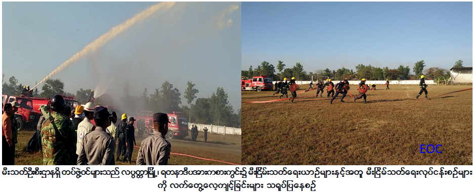 ကယ်ဆယ်ရေးနှင့်ပြန်လည်နေရာချထားရေးဦးစီးဌာန၊ လပွတ္တာခရိုင်ဦးစီးမှူးရုံး၊ လပွတ္တာမြို့နယ်မီးသတ်ဦးစီးဌာနနှင့် အထွထွေ အုပ်ချုပ်ရေးဦးစီးဌာနတို့မှ တာဝန်ရှိသူများ၊ စျေးသူ/ စျေးသားများနှင့် ပူးပေါင်း၍ (၂၃-၂-၂၀၁၇) ရက်နေ့၊ နံနက် (ဝ၇းဝ၀) အချိန်တွင် လပွတ္တာမြို့၊ အောင်ဇေယျစျေးကြီး၌ မီးဘေးအန္တရာယ်ကင်းဝေးစေရန် မီးငြိမ်းသတ်ရေးလက်တွေ့လေ့ကျင့်ခန်းများ ဆောင်ရွက်ခဲ့ပါသည်။ ထို့ပြင် နံနက် (၀၈းဝ၀) အချိန်တွင် လပွတ္တာမြို့၊ ရတနာဒီပအားကစားကွင်း၌ မီးသတ်ဦးစီးဌာနရှိ တပ်ဖွဲ့ဝင်များသည် မီးငြိမ်းသတ်ရေးယာဉ်များနှင့်အတူ မီးငြိမ်သတ်ရေးလုပ်ငန်းစဉ်များကို လက်တွေ့လေ့ကျင့်ခြင်းများ ဆောင်ရွက် ခဲ့ပြီး လပွတ္တာခရိုင်ဦးစီး မှူးရုံး (ကဆရ) မှ လည်း သဘာဝဘေးအသိပညာပေး လက်ကမ်းစာစောင် များ ဖြန့်ဝေဆောင်ရွက်ခဲ့ ကြောင်း သတင်းရရှိပါသည်။
