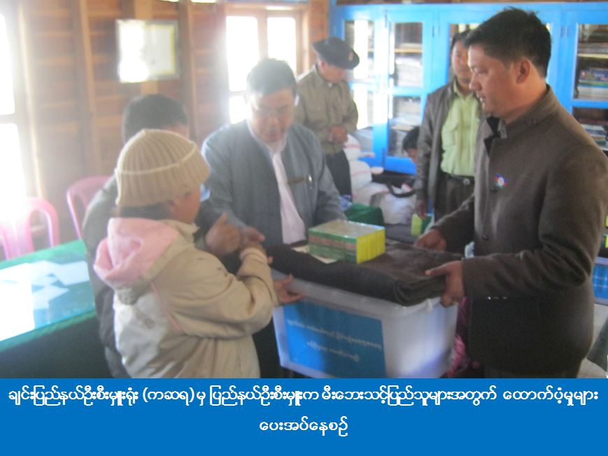 (၂၄-၂-၂၀၁၇) ရက်နေ့တွင် ချင်းပြည်နယ်၊ ဟားခါးမြို့၊ စျေးသစ်ရပ်ကွက်၊ ချယ်ရီလမ်းနှင့် အ.ထ.က (၁) ပညာရေးဝန်ထမ်းအိမ်ယာဘေးလမ်းကြားရှိ အိမ်၌ မီးလောင်မှု ဖြစ်ပွားခဲ့ရာ ကယ်ဆယ်ရေးနှင့်ပြန်လည်နေရာချထားရေးဦးစီးဌာန၊ ချင်းပြည်နယ်ဦးစီးမှူးရုံးမှ မီးဘေးသင့်ခဲ့သည့် အိမ်ထောင်စု (၇) စုမှ လူဦးရေ ကျား(၁၂)၊ မ(၁၄)၊ စုစုပေါင်း (၂၆) ဦးအတွက် ကယ်ဆယ်ရေးပစ္စည်း (၉) မျိုး၊ (၄) မျိုး၊ Family Kit (၇) အိတ်၊ JICA စောင်(၇)ထည်၊ ရေပုံးအပြာရောင် (၇) ပုံး၊ ထွန်းရွှေဝါ အစာကြေဆေး (၇) ကဒ်၊ အိမ်ဆောက်ပစ္စည်းဖိုးငွေ၊ ဆန်ရိက္ခာ (၁၀) ရက်စာဖိုးငွေနှင့် သေဆုံးသူ (၁) ဦးအတွက် ထောက်ပံ့ငွေ၊ စုစုပေါင်းထောက်ပံ့ငွေ (၃၉၈,၀၀၀) ကျပ်အား ထောက်ပံ့ပေးအပ်ခဲ့ကြောင်း သိရှိရပါသည်။
