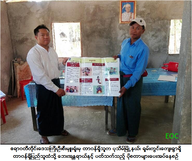 လူမှုဝန်ထမ်း၊ ကယ်ဆယ်ရေးနှင့်ပြန်လည်နေရာချထားရေးဝန်ကြီးဌာန၊ ကယ်ဆယ်ရေးနှင့့်ပြန်လည်နေရာချထားရေးဦးစီးဌာန၊ ဧရာဝတီတိုင်းဒေသကြီးဦးစီးမှူးရုံးမှ တာဝန်ရှိသူများသည် ဧရာဝတီတိုင်းဒေသကြီး၊ ပုသိမ်မြို့နယ်၊ ရှမ်းကွင်းကျေးရွာ၌ သဘာဝဘေးအန္တရာယ်စီမံခန့်ခွဲမှုနှင့် ဘေးအန္တရာယ်လျော့ပါးရေးဆိုင်ရာ အသိပညာပေးဟောပြောပွဲအား (၂၇-၂-၂၀၁၇) ရက်နေ့တွင် ကျင်းပပြုလုပ်ခဲ့ရာ တက်ရောက်သူပြည်သူ (၁၅၀) ဦးတက်ရောက်ခဲ့ပါသည်။ ထို့ပြင် မီးဘေး၊ ရေဘေး၊ မုန်တိုင်းဘေး၊ ငလျင်ဘေး၊ ဆူနာမီဘေး၊ မြေပြိုဘေး၊ မိုကြိုးဘေး စသည့် အသိပညာပေးလက်ကမ်းစာစောင်များ၊ ပိုစတာများဖြန့်ဝေခဲ့ကြောင်း သတင်းရရှိပါသည်။