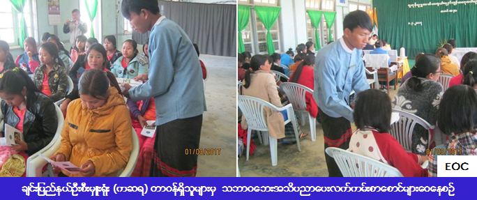 (၁-၃-၂၀၁၇) ရက်နေ့၊ နယ်စပ်ရေးရာဝန်ကြီးဌာန၊ ပညာရေးနှင့်လေ့ကျင့်ရေးဦးစီးဌာန၊ အမျိုးသမီးအိမ်တွင်းမှု သက်မွေးလုပ်ငန်းပညာသင်တန်းကျောင်း၊ ဟားခါးမြို့၌ “လူကုန်ကူးမှုတားဆီးကာကွယ်ရေးနှင့် ကျန်းမာရေး အသိပညာပေးဟောပြောပွဲအခမ်းအနား”တွင် ကယ်ဆယ်ရေးနှင့်ပြန်လည်နေရာချထားရေးဦးစီးဌာန၊ ချင်း ပြည်နယ်ဦးစီးမှူးရုံး တာဝန်ရှိသူများမှ သဘာဝဘေးအန္တရာယ်အကြောင်း ရှောင်ရန်/ ဆောင်ရန်များကို ဟောပြောခဲ့ပြီး ဘေး (၈) မျိုးပါ လက်ကမ်းစာစောင်များကို ဖြန့်ဝေပေးခဲ့ပါသည်။သင်တန်းသူများ၊ နည်းပြများ၊ ဌာနဆိုင်ရာမှကိုယ်စားလှယ်များ စုစုပေါင်း (၇၀) ဦးခန့်ရှိကြောင်း သတင်းရရှိပါသည်။