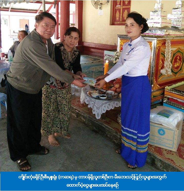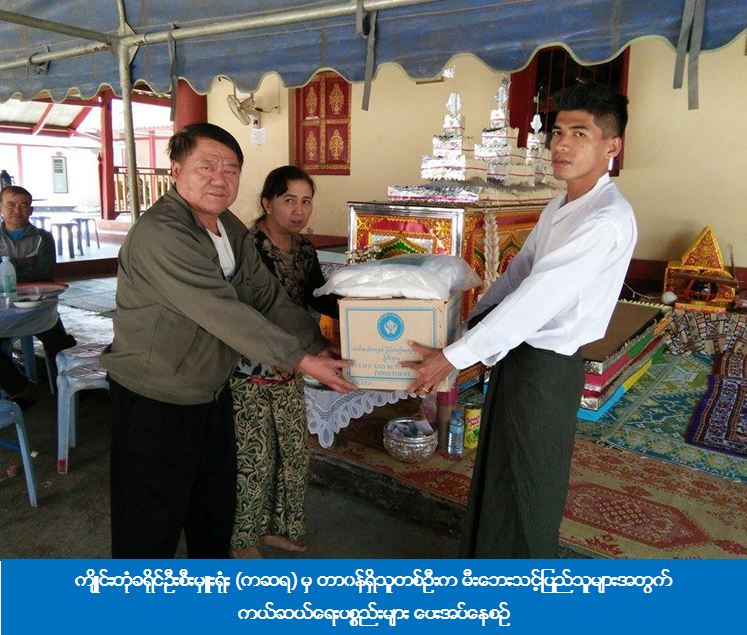 (၄-၃-၂၀၁၇) ရက်နေ့၊ ည (၁၉:ဝ၀) နာရီအချိန်တွင် ကျိုင်းတုံမြို့၊ အမှတ် ၃ ရပ်ကွက်၊ နောင်ခမ်းတိုက်ရပ်၌ အိမ်ရှင် ဒေါ်နန်းအို နေအိမ် ဘုရားမီးမှတဆင့် မီးလောင်မှုဖြစ်ပွားခဲ့ရာ အိမ်ခြေ (၁) အိမ်၊ အိမ်ထောင်စု (၁) စုမှ လူဦးရေ (၈) ဦးမီဘေးသင့်ခဲ့ပြီး (၁) ဦးသေဆုံးခဲ့ပါသည်။ အဆိုပါဘေးသင့်ပြည်သူများအတွက် ကယ်ဆယ်ရေးပစ္စည်း (၉) မျိုး (၁) အိမ်ထောင်စာ၊ တိုက်အိမ်အမျိုးအစားအတွက် အိမ်ဆောက်ပစ္စည်းဖိုးငွေ (၂) သိန်း၊ လူဦးရေ (၈) ဦးအတွက် ဆန်ရိက္ခာဖိုးငွေ (၇၂၀၀) ကျပ်နှင့် သေဆုံးသူ (၁) ဦးအတွက် နာရေးထောက်ပံ့ငွေ (၁) သိန်းကျပ် စုစုပေါင်းထောက်ပံ့ခဲ့သောကယ်ဆယ်ရေးရန်ပုံငွေ (၃၀၇၂၀၀) ကျပ်တိတိ အား ကျိုင်းတုံခရိုင်ဦးစီးမှူးရုံး (ကဆရ) မှ တာဝန်ရှိသူများက (၅-၃-၂၀၁၇) ရက်နေ့တွင် သွားရောက်ထောက်ပံ့ပေးခဲ့ကြောင်း သိရှိရပါသည်။