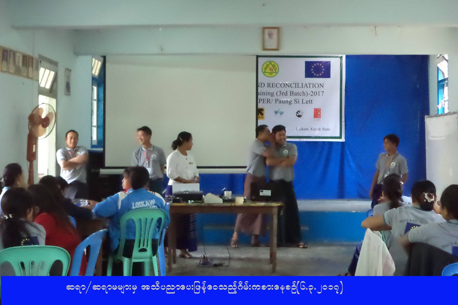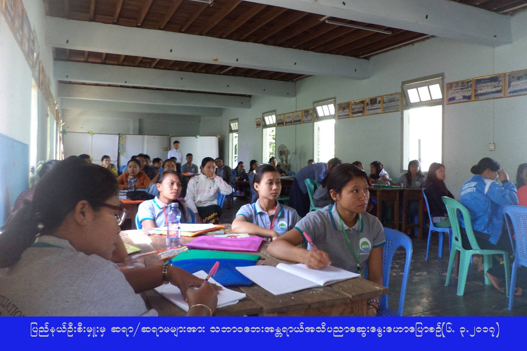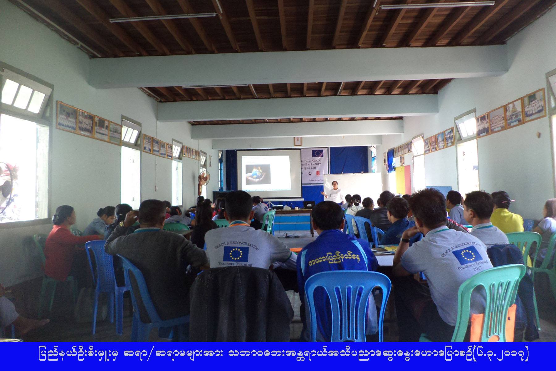 (၁-၃-၂၀၁၇) ရက်နေ့မှ (၆-၃-၂၀၁၇) ရက်နေ့ထိ AVSI မှ ဖွင့်လှစ်သည့် ငြိမ်းချမ်းရေးနှင့် ရင်ကြားစေ့ရေးသင်တန်းသို့ တက်ရောက်လာသည့် ကယားပြည်နယ်အတွင်းရှိ ဆရာ/ဆရာမ (၃၉) ဦးအား ကယားပြည်နယ်ဦးစီးမှူးရုံး (ကဆရ) မှ ပြည်နယ်ဦးစီးမှူးက (၆-၃-၂၀၁၇) ရက်နေ့တွင် သဘာဝဘေးအန္တရာယ်ဆိုင်ရာအကြောင်းအရာများနှင့်စပ်လျဉ်း၍ အသိပညာဆွေးနွေးဟောပြောခဲ့ကြောင်း သိရှိရပါသည်။