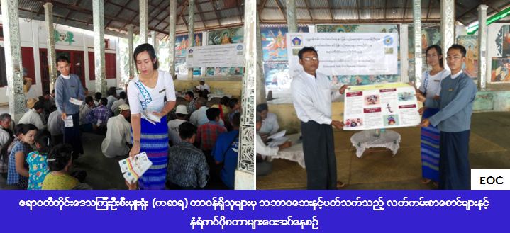 ကယ်ဆယ်ရေးနှင့် ပြန်လည်နေရာချထားရေးဦးစီးဌာန၊ ဧရာဝတီတိုင်းဒေသကြီးဦးစီးမှူးရုံး(ကဆရ)မှ တာဝန်ရှိသူများသည် (၉-၃-၂၀၁၇) ရက်နေ့တွင် ဧရာဝတီတိုင်းဒေသကြီး၊မအူပင်ခရိုင်၊ ဓနုဖြူမြို့နယ်၊ စံကင်းကျေးရွာအုပ်စု၊ ပက်တန်းကျေးရွာ ဘုန်းတော်ကြီးကျောင်း၌ သဘာဝဘေးအန္တရာယ်စီမံခန့်ခွဲမှုနှင့် ဘေးအန္တရာယ်လျော့ပါးရေး အသိပညာပေးဟောပြောပွဲ ကျင်းပပြုလုပ်ခဲ့ပြီး သဘာဝဘေးလျော့ပါးရေး အသိပညာပေးလက်ကမ်းစာစောင်များ၊ နံရံကပ်ပိုစတာများဖြန့်ဝေပေးခြင်းနှင့် DAN Mobile Application အသုံးပြုပုံ/အသုံးပြုနည်းလမ်းများအား ရှင်းလင်းပြောကြားခြင်းများကို ဆောင်ရွက်ခဲ့ပါသည်။ အဆိုပါ ဟောပြောပွဲသို့ တက်ရောက်သူဦးရေ (၁၀၀) ဦးခန့်ရှိကြောင်း သတင်းရရှိပါသည်။