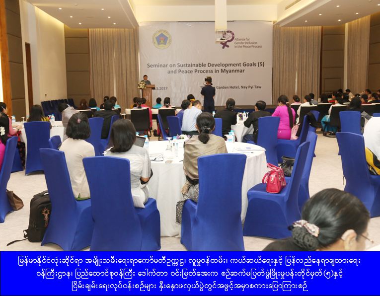 ဆက်လက်၍ ပြည်ထောင်စုဝန်ကြီးက ငြိမ်းချမ်းရေးလုပ်ငန်းစဉ်များတွင် အမျိုးသမီးများပါဝင်ဖို့ အားပေးဆောင်ရွက်နေသလို ပါဝင်ရန်လည်းတိုက်တွန်းလိုပါကြောင်း၊ဤအလုပ်ရုံဆွေးနွေးပွဲတွင် အမျိုးသမီး လွှတ်တော် ကိုယ်စားလှယ်များပါဝင်သည်ကိုတွေ့ရကြောင်း၊ မိမိတို့ဝန်ကြီးဌာနသည် လွှတ်တော်ကိုယ်စား လှယ်များ၏ပြည်သူ့အကျိုးလိုအပ်မှုတင်ပြချက်များကို အလေးထား၍ အလျင်အမြန် အကောင်အထည် ဖေါ်ဆောင်ရွက်ပေး နေသကဲ့သို့မိမိတို့ဆောင်ရွက်လျက်ရှိသည့် အမျိုးသမီးများဖွံ့ဖြိုးတိုးတက်ရေး ကိစ္စရပ်များကိုလည်း အမျိုးသမီးလွှတ်တော်ကိုယ်စားလှယ်ကြီးများ သဘောပေါက်နားလည်၍ ပူးပေါင်းဆောင်ရွက်ကြခြင်းဖြင့် အမျိုးသမီးထု၏ ဦးဆောင်မှုနှင့်ပါဝင်မှုပိုမိုအားကောင်းလာမည်ဖြစ်ကြောင်း၊ ယနေ့သည် အမျိုး သမီးလှုပ်ရှားမှုဆိုင်ရာရက်သတ္တပါတ်၏ ဆဌမမြောက်နေ့ဖြစ်ပြီး ဤစဉ်ဆက်မပြတ်ဖွံဖြိုးမှုပန်းတိုင်အမှတ်(၅) နှင့်ငြိမ်းချမ်းရေးလုပ်ငန်းစဉ်များနှီးနှောဖလှယ်ပွဲတွင်လူမှုဝန်ထမ်း၊ကယ်ဆယ်ရေးနှင့် ပြန်လည်နေရာချထားရေး ဝန်ကြီးဌာနက ၂၀၁၆ခုနှစ်၊ဒီဇင်ဘာလအတွင်းက ကျင်းပခဲ့သော ငြိမ်းချမ်းရေးဖြစ်စဉ်နှင့် ဒီမိုကရေစီ ပြောင်းလဲ နိုင်စွမ်းရှိသောအမျိုးသမီးများညှိနှိုင်းဆွေးနွေးပွဲ၏ ရလဒ်များကို ထည့်သွင်းဆွေးနွေးကြမည်ဖြစ်ပြီး ဝန်ကြီးဌာန က အကောင်အထည်ဖေါ်လျက်ရှိသည့် အမျိုးသမီးများဖွံ့ဖြိုးတိုးတက်ရေးအမျိုးသားအဆင့် မဟာဗျူဟာစီမံ ကိန်းတွင် အသုံးပြုအကောင်အထည်ဖေါ်ရေး၊ကုလသမဂ္ဂကွန်းဗင်းရှင်းပါ အမျိုးသမီးများအား နည်းမျိုးစုံဖြင့် အကြမ်းဖက်မှုပပျောက်ရေးပါ မြန်မာနိုင်ငံအတွက် အကြံပြုသုံးသပ်ချက်များကို ဆောင်ရွက်နိုင်ရေးနှင့် စဉ်ဆက်မပြတ်ဖွံဖြိုးတိုးတက်ရေး(၁၇)ချက်မှ အမှတ်(၅) အချက်ဖြစ်သော ကျား/မတန်းတူညီမျှရေး၊ အမျိုး သမီးများ၊မိန်းကလေးငယ်များအားလုံး စွမ်းပကား မြင့်မားရေးကိစ္စများ ဖြည့်ဆည်းပေးနိုင်ရေး စသည်တို့တွင် အမျိုးသမီးများနားလည်သဘောပေါက်ခြင်းဖြင့် ပါဝင်အားဖြည့်နိုင်ရေး၊ပဋိပက္ခဖြစ်ပွားရာနေရာများတွင် ယာယီ စခန်းများ၌ခေတ္တနေထိုင်နေရသော အမျိုးသမီး၏ ငြိမ်းချမ်းရေးလိုလားမှုနှင့် ငြိမ်းချမ်းရေးဆောင်ရွက်မှုများ တွင် အသိတရားဖြင့်အဓိပ္ပာယ်ရှိစွာ ပါဝင်လာရေး၊ဆောင်ရွက်ပေးနိုင်ရေးတို့ကိုမှာကြားတိုက်တွန်းခဲ့ကြောင်း သိရှိရပါသည်။