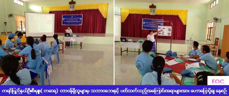 ကယ်ဆယ်ရေးနှင့် ပြန်လည်နေရာချထားရေးဦးစီးဌာန၊ ကရင်ပြည်နယ်ဦးစီးမှူးရုံးမှ တာဝန်ရှိသူများသည် ကရင်ပြည်နယ်၊လှိုင်းဘွဲ့မြို့နယ်အုပ်ချုပ်ရေးမှူးအစည်းအဝေးခန်းမ၌ သဘာဝဘေးလျော့ပါးရေးစေတနာ့ဝန်ထမ်းလူငယ် (ဆင့်ပွား) သင်တန်း (၂/၂၀၁၇) ကို (၂၁-၃-၂၀၁၇) ရက်နေ့မှ (၂၃-၃-၂၀၁၇) ရက်နေ့အထိ သင်တန်းကာလ (၃) ရက်ကြာ ကျင်းပပြုလုပ်မည်ဖြစ်ပါသည်။ အဆိုပါ ဟောပြောပွဲတွင် အုပ်ချုပ်ရေးမှူးမှ အဖွင့်အမှာစကားပြောကြားပြီး ပြည်နယ်ဦးစီးမှူး (ကဆရ) မှ သင်တန်းဖွင့်လှစ်ရခြင်းနှင့် ပတ်သက်သည့် အကြောင်းအရာများအား ရှင်းလင်းပြောကြားခဲ့ပါသည်။ သင်တန်းဖွင့်ပွဲ၌ မြို့နယ်အဆင့် ဌာနဆိုင်ရာမှ သင်တန်းသား/ သင်တန်းသူ စုစုပေါင်း (၈၀) ဦးတက်ရောက်ခဲ့ကြောင်း သတင်းရရှိပါသည်။