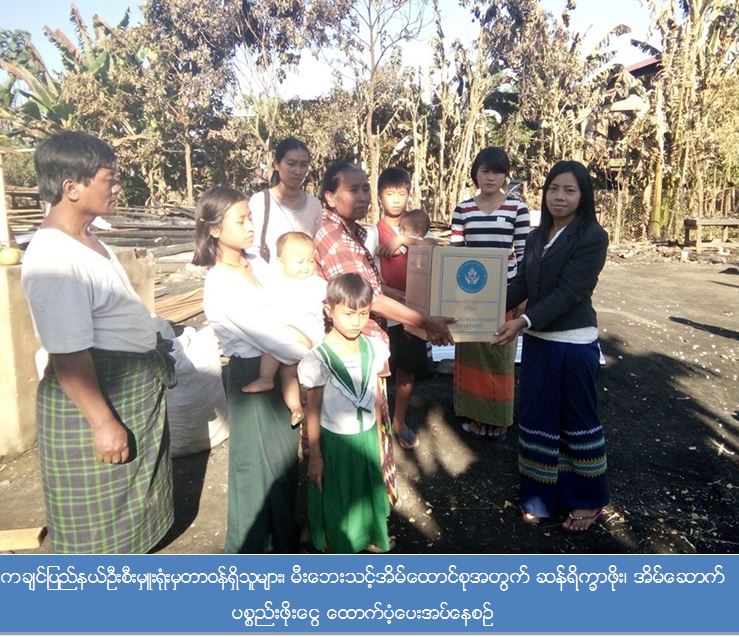 ကယ်ဆယ်ရေးနှင့် ပြန်လည်နေရာချထားရေးဦးစီးဌာန၊ ကချင်ပြည်နယ်ဦးစီးမှူးရုံးမှ တာဝန်ရှိသူများသည် ကချင်ပြည်နယ် မြစ်ကြီးနားမြို့ ပလနကျေးရွာ နယ်မြေ-၄တွင် (၅.၁၂.၂၀၁၆) ရက်နေ့ဖြစ်ပွားသော မီးဘေးကြောင့် ဘေးသင့် အိမ်ခြေ(၁)လုံး အိမ်ထောင်စု(၂)စု လူဦးရေ (၉) ဦးတို့အတွက် ကယ်ဆယ် ရေးပစ္စည်း (၉) မျိုး (၂) အိမ်ထောင်စုစာ ဆန်ရိက္ခာဖိုးငွေ (၈၁၀၀) ကျပ်နှင့် အိမ်ဆောက်ပစ္စည်း ဖိုးငွေ(၁၀၀၀၀၀)ကျပ်တို့ကို (၆.၁၂.၂၀၁၆)ရက်နေ့တွင် သွားရောက်ထောက်ပ့ံပေးအပ်ခဲ့ကြောင်းသတင်း ရရှိပါသည်။