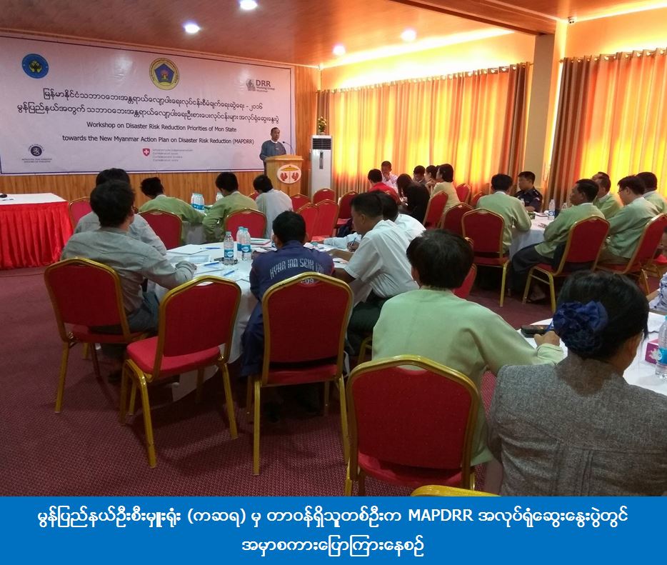 ကယ်ဆယ်ရေးနှင့် ပြန်လည်နေရာချထားရေးဦးစီးဌာန၊ မွန်ပြည်နယ်ဦးစီးမှူးရုံးနှင့် UNDP တို့ပူးပေါင်း၍ “MAPDRRအလုပ်ရုံဆွေးနွေးပွဲ” ကို မွန်ပြည်နယ်၊ ရာမညဟိုတယ်၌ (၂၁-၃-၂၀၁၇) မှ (၂၂-၃-၂၀၁၇) ထိ ကျင်းပပြုလုပ်ခဲ့ရာ သက်ဆိုင်ရာဌာနများမှ တာဝန်ရှိသူများတက်ရောက်ဆွေးနွေးခဲ့ကြကြောင်း သိရှိရပါသည်။