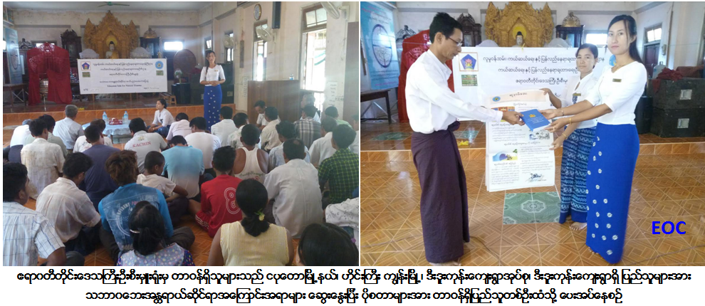 လူမှုဝန်ထမ်း၊ ကယ်ဆယ်ရေးနှင့်ပြန်လည်နေရာချထားရေးဝန်ကြီးဌာန၊ ကယ်ဆယ်ရေးနှင့်ပြန်လည်နေရာချထားရေးဦးစီးဌာန၊ ဧရာဝတီတိုင်း ဒေသကြီးဦးစီးမှူးရုံးမှ တာဝန်ရှိသူများသည် (၂၂-၃-၂၀၁၇) ရက်နေ့တွင် ဧရာဝတီတိုင်းဒေသကြီး၊ ပုသိမ်ခရိုင်၊ ငပုတောမြို့နယ်၊ ဟိုင်းကြီး ကျွန်းမြို့၊ ဒီးဒူးကုန်းကျေးရွာအုပ်စု၊ ဒီးဒူးကုန်းကျေးရွာရှိ ထူပါရုံဘုန်းတော်ကြီးကျောင်း ဓမ္မာရုံ၌ သဘာဝဘေးအန္တရာယ်စီမံခန့်ခွဲမှုနှင့် ဘေးအန္တရာယ်လျော့ပါးရေး အသိပညာပေးဟောပြောပွဲအားပြုလုပ်ခဲ့ရာ ကျေးရွာသူ၊ ကျေးရွာသား (၁၂၀) ဦးတက်ရောက်ခဲ့ပြီး တက်ရောက် လာသူ ကျေးရွာပြည်သူများအား လက်ကမ်းစာစောင်များ၊ ပိုစတာများ ဖြန့်ဝေခြင်းနှင့် DAN Mobile Application ဖြန့်ဝေခြင်း လုပ်ငန်းများကို ဆောင်ရွက်ပေးခဲ့ကြောင်း သတင်းရရှိပါသည်။