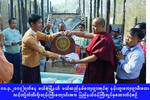 (၁၀-၃-၂၀၁၇) ရက်နေ့၌ ဘောလခဲခရိုင်၊ မယ်စဲ့မြို့နယ်၊ နမ်ဆည်ကျေးရွာအုပ်စု၊ နန်းဟူကျေးရွာ ကျိုက်ထီးရိုးဘုန်းကြီးကျောင်း မီးလောင်ကျွမ်းခဲ့ရာ ကယားပြည်နယ်ဦးစီးမှူးရုံး (ကဆရ) မှ မီးဘေးသင့်သံဃာတော်များအတွက် (၁၁-၃-၂၀၁၇) ရက်နေ့တွင် ပြည်နယ်ဝန်ကြီးချုပ်ခရီးစဉ်အတွင်း မိုးကာလိပ် (၁) လိပ်၊ (၆) ဦးဆံ့မိုးကာတဲ (၁) လုံး၊ ဒန်အိုး (၄) လုံးနှင့် Family Kit (၂) စုံတို့ထောက်ပံ့ပေးခဲ့ပြီးဖြစ်သည်။