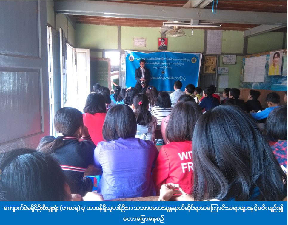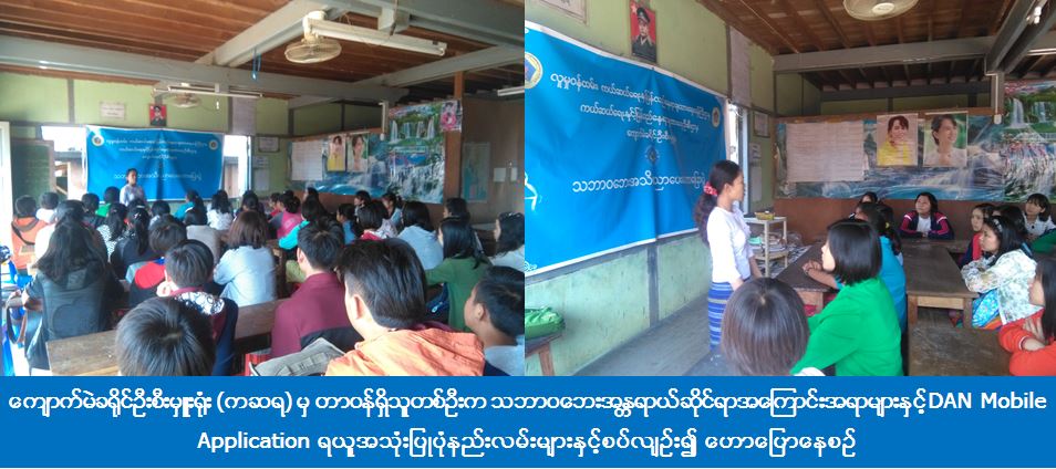 ကျောက်မဲခရိုင်ဦးစီးမှူးရုံး (ကဆရ) မှ တာဝန်ရှိသူများသည် (၂၉-၃-၂၀၁၇) ရက်နေ့တွင် ကျောက်မဲမြို့နယ်၊ ရပ်ကွက် (၁) နွေရာသီအင်္ဂလိပ်စာသင်တန်း၌ သဘာဝဘေးအသိပညာပေးဟောပြောခြင်းနှင့် DAN Mobile Application ရယူအသုံးပြုပုံနည်းလမ်းများ ဖြန့်ဝေခြင်းတို့ဆောင်ရွက်ခဲ့ရာ ကျောင်းသား/သူ (၁၅၀) ဦးခန့်တက်ရောက်ခဲ့ကြောင်း သိရှိရပါသည်။