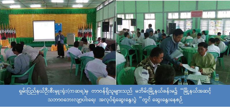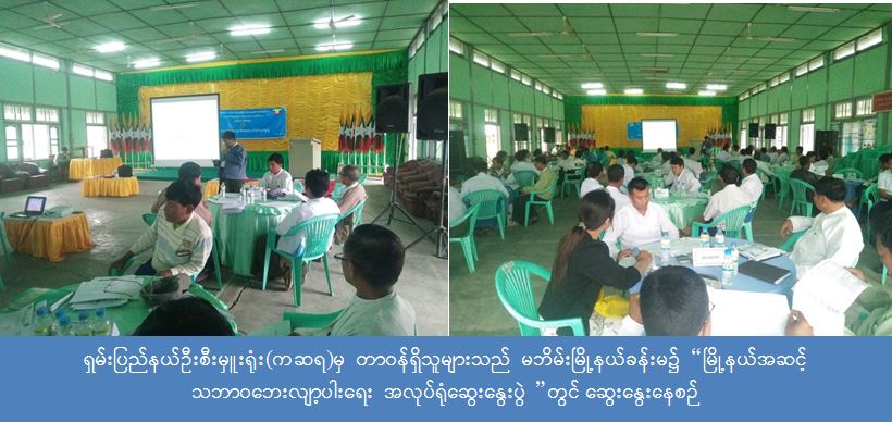 ကယ်ဆယ်ရေးနှင့် ပြန်လည်နေရာချထားရေးဦးစီးဌာန၊ ရှမ်းပြည်နယ်ဦးစီးမှူးရုံးမှ တာဝန်ရှိသူများသည် (၃၀-၃-၂၀၁၇) ရက်နေ့ နံနက်ပိုင်းတွင် မဘိမ်းမြို့နယ်ခန်းမ၌ မြို့နယ်အဆင့် သဘာဝဘေးလျော့ပါးရေးအလုပ်ရုံ ဆွေးနွေးပွဲ ကျင်းပပြုလုပ်ခဲ့ရာ ဗမာတိုင်းရင်းသားဝန်ကြီးနှင့် ခရိုင်အုပ်ချုပ်ရေးမှူးတို့မှ အဖွင့်အမှာစကား ပြောကြားပြီး ပြည်နယ်မှူး (ကဆရ) မှဦးဆောင်ဆွေးနွေးဟောပြောခြင်းများ ပြုလုပ်ခဲ့ပါသည်။ အဆိုပါ အလုပ်ရုံ ဆွေးနွေးပွဲသို့ စုစုပေါင်း (၈၀) ဦးတက်ရောက်ခဲ့ကာ တက်ရောက်လာသူများမှ အဖွဲ့လိုက်တင်ပြဆွေးနွေး ခြင်းနှင့် DAN Mobile Application ဖြန့်ဝေပေးခြင်းတို့ကိုပြုလုပ်ခဲ့ကြောင်း သိရှိရပါသည်။