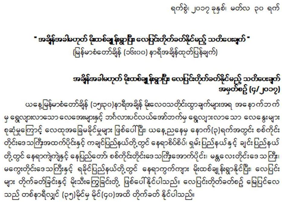 မိုးလေဝသနှင့် ဇလဗေဒညွှန်ကြားမှုဦးစီးဌာနမှ ထုတ်ပြန်ထားသော အချိန်အခါမဟုတ်မိုးထစ်ချုန်းရွာပြီး လေပြင်းတိုက်ခတ်မည့်သတိပေးချက်