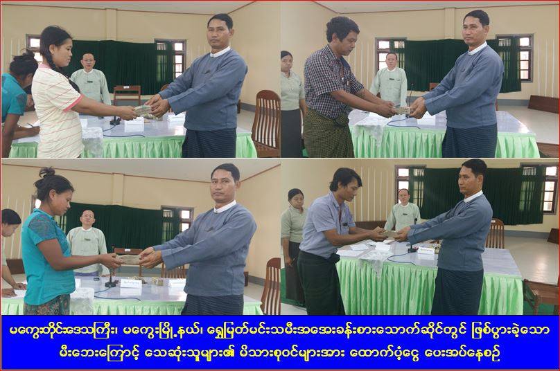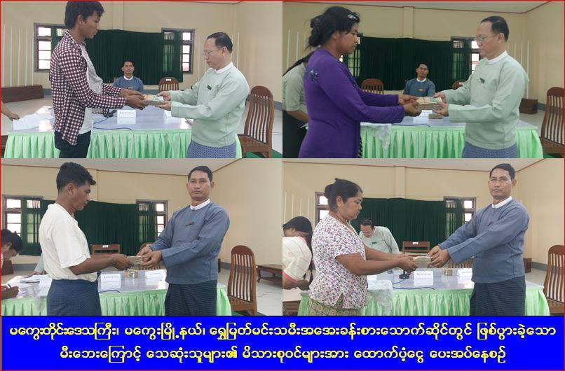 (၂-၄-၂၀၁၇)ရက်နေ့၌ မကွေးတိုင်းဒေသကြီး၊ မကွေးတိုင်းဒေသကြီး၊ မကွေးမြို့နယ်၊မကွေးမြို့မြင်သာရပ်၊ ၂၉ လမ်း နှင့် သစ္စာလမ်းထောင့်ရှိ ရွှေမြတ်မင်းသမီးအအေးခန်းစားသောက်ဆိုင်တွင် ဖြစ်ပွားခဲ့သော မီးလောင်ကျွမ်းမှုကြောင့် သေဆုံးသွားသူ (၁၅)ဦးအနက် ပိုင်ရှင်အတည်ပြုပြီးဖြစ်သော သေဆုံးသူ(၁၁)ဦး တို့အတွက် တစ်ဦးလျှင် (၃၀၀,၀၀၀/-) ကျပ်နှုန်းဖြင့် ထောက်ပံ့ငွေ စုစုပေါင်း (၃,၃၀၀,၀၀၀/-)ကျပ်အား လူမှုဝန်ထမ်း၊ ကယ်ဆယ်ရေးနှင့် ပြန်လည်နေရာချထားရေးဝန်ကြီးဌာန၊ ကယ်ဆယ်ရေးနှင့် ပြန်လည်နေရာချထားရေး ဦးစီးဌာန၊ မကွေးတိုင်းဒေသကြီးဦးစီးမှူးရုံးမှ တာဝန်ရှိသူများက (၃-၄-၂၀၁၇)ရက်နေ့ (၁၇:၀၀)နာရီအချိန်တွင် ကျန်ရစ်သူမိသားစုများသို့ ထောက်ပံ့ပြီးဖြစ်ပါကြောင်း သတင်းရရှိပါသည်။