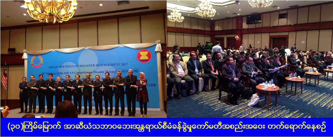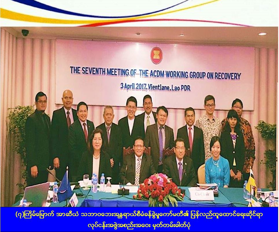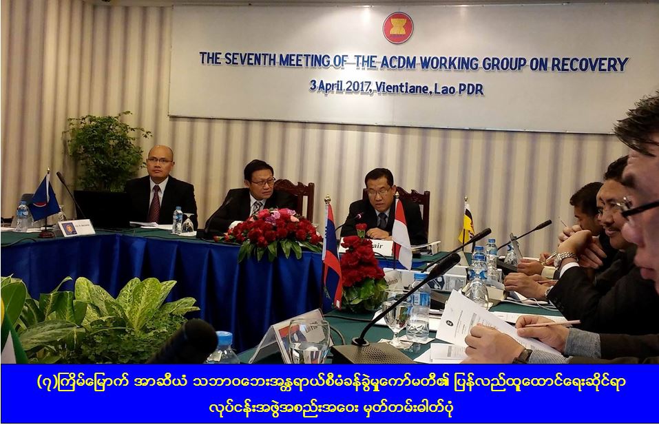 လာအိုနိုင်ငံ၊ Vientiane မြို့၌ ၂၀၁၇ ခုနှစ်၊ ဧပြီလ (၃)ရက်နေ့မှ (၆)ရက်နေ့အထိ ကျင်းပပြုလုပ်သည့် (၇)ကြိမ်မြောက် အာဆီယံ သဘာဝဘေးအန္တရာယ်စီမံခန့်ခွဲမှုကော်မတီ၏ ပြန်လည်ထူထောင်ရေးဆိုင်ရာ လုပ်ငန်းအဖွဲ့အစည်းအဝေး၊ (၃၀)ကြိမ်မြောက် အာဆီယံသဘာဝဘေးအန္တရာယ်စီမံခန့်ခွဲမှုကော်မတီအစည်းအဝေးနှင့် အခြားဆက်စပ်အစည်းအဝေးများအား လူမှုဝန်ထမ်း၊ ကယ်ဆယ်ရေးနှင့် ပြန်လည်နေရာချထားရေးဝန်ကြီးဌာန၊ ကယ်ဆယ်ရေးနှင့် ပြန်လည်နေရာချထားရေးဦးစီးဌာန၊ ညွှန်ကြားရေးမှူးချုပ် ဒေါက်တာကိုကိုနိုင်နှင့် မြန်မာကိုယ်စားလှယ်(၂)ဦး တက်ရောက်ခဲ့ပါသည်။ အဆိုပါ (၇)ကြိမ်မြောက် အာဆီယံ သဘာဝဘေးအန္တရာယ်စီမံခန့်ခွဲမှု ကော်မတီ၏ ပြန်လည်ထူထောင်ရေးဆိုင်ရာ လုပ်ငန်းအဖွဲ့အစည်းအဝေး၌ ကယ်ဆယ်ရေးနှင့် ပြန်လည်နေရာချထားရေးဦးစီးဌာန၊ ညွှန်ကြားရေးမှူးချုပ် ဒေါက်တာကိုကိုနိုင်က ပူးတွဲဥက္ကဌအဖြစ် ဆောင်ရွက်ခဲ့ပြီး အဖွင့်အမှာစကားပြောကြားခဲ့ကြောင်း၊ အစည်းအဝေးတွင် အာဆီယံနိုင်ငံများအတွင်း သဘာ၀ဘေးအန္တရာယ်ကျရောက်ချိန်များ၌ လူမှုကာကွယ် စောင့်ရှောက်ရေးလုပ်ငန်းများဆောင်ရွက်ခြင်းဆိုင်ရာ လမ်းညွှန်ကို အာဆီယံအဆင့်၌ အင်ဒိုနီးရှားနှင့်မြန်မာနိုင်ငံတို့၏ ဦးဆောင်မှုဖြင့် ရေးဆွဲနိုင်ရေးအတွက် လိုအပ်သည်များကို ဆွေးနွေးခဲ့ပါသည်။ ထို့အပြင် နှစ်နိုင်ငံဦးဆောင်မှုဖြင့် သဘာ၀ဘေးအန္တရာယ်ကျရောက်ချိန်များတွင် အိမ်နီးချင်း မြို့ပြ/ ကျေးရွာအချင်းချင်း အပြန်အလှန်ထောက်ပံ့ကူညီပေးနိုင်မည့် Twin Sister Cities/ Villages စီမံချက်ကို အကောင်အထည်ဖော်နိုင်မည့်အခြေအနေ၊ အာဆီယံနိုင်ငံများမှ ပြန်လည်ထူထောင်ရေးလုပ်ငန်းများအတွက် အကောင်းဆုံးဆောင်ရွက်ပေးနိုင်ခဲ့သည့် ချန်ပီယံမြို့တော်များကို ရွေးချယ်ပေးနိုင်ရေး၊ အာဆီယံဒေသတွင်းပြန်လည်ထူထောင်ရေးဖိုရမ်အား၂၀၁၇ခုနှစ်၊ ဇူလိုင်လအတွင်း ကျင်းပနိုင်ရန် ကြိုတင်ပြင်ဆင်မှုများကို ဆွေးနွေးခဲ့ကြကြောင်း သတင်းရရှိပါသည်။